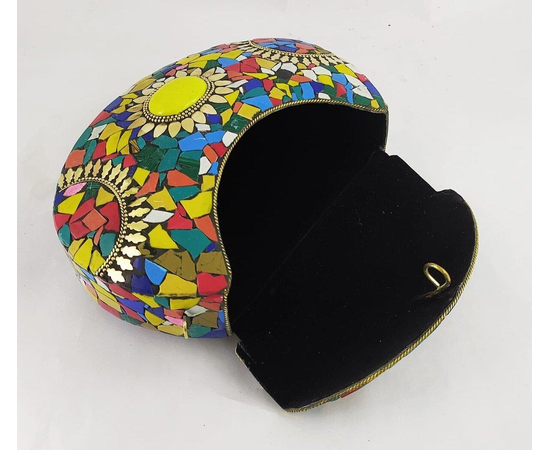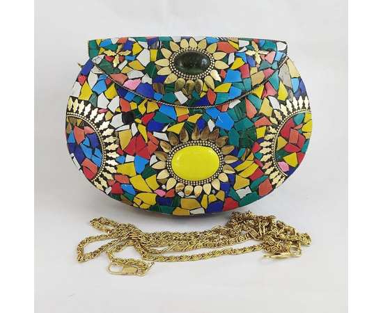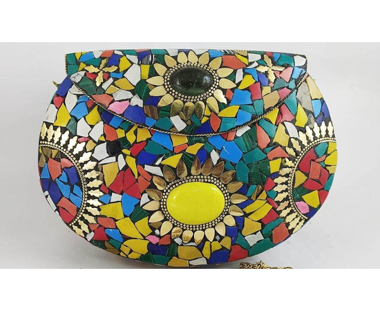 Beautiful vintage handmade mosaic bag decorated with multi color stones and antique details. This bag comes with a detachable chain, you can use it as a clutch or you can use it as a cross body bag. Designed by an artisan by cutting metal into the box frame and decorating it with colored stones and tiles pieces and brass elements. Bag Inner Side is Velvet coated, this bag Clutch is suitable to keep Smart Cellphone and small accessories like Keys, Lipstick, Cards etc.