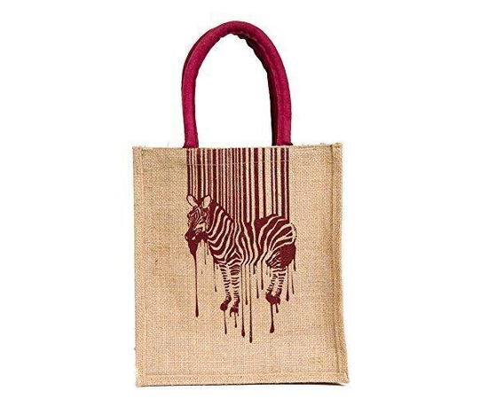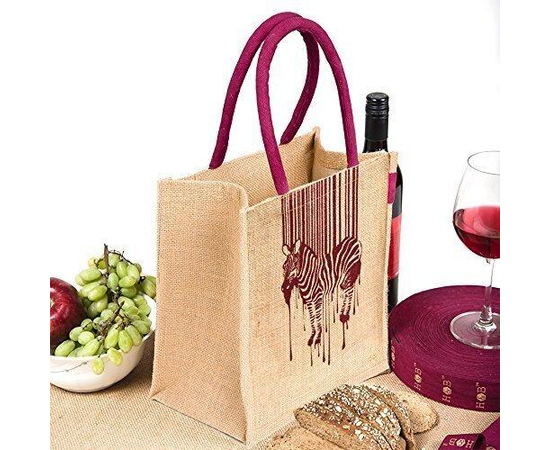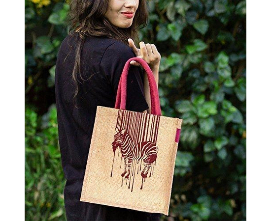 H&B Jute handbag, Handmade Indian Jute Tote Bag, Reusable Carry Bag, tiffin bag, Zebra Maroon Printed bag, Eco-Friendly Tote, Shopper with handle, Waterproof, With Inner Compartments, Indian Handicraft