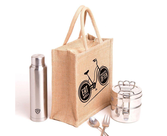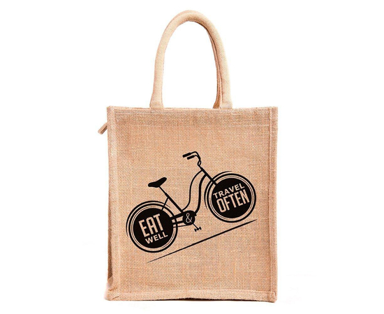 Jute handbag, Handmade Indian Jute Tote Bag, Reusable Carry Bag, tiffin bag, Eat well Travel often Printed, Eco-Friendly Tote, Shopper with handle, Waterproof, With Inner Compartments – ZIP, BOTTLE HOLDER, Indian Handicraft