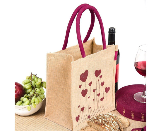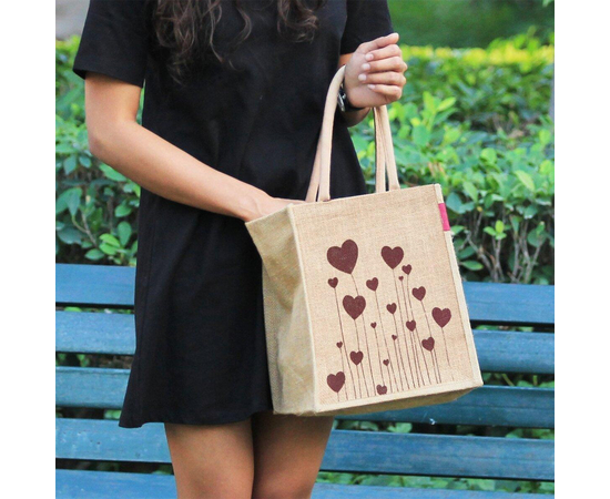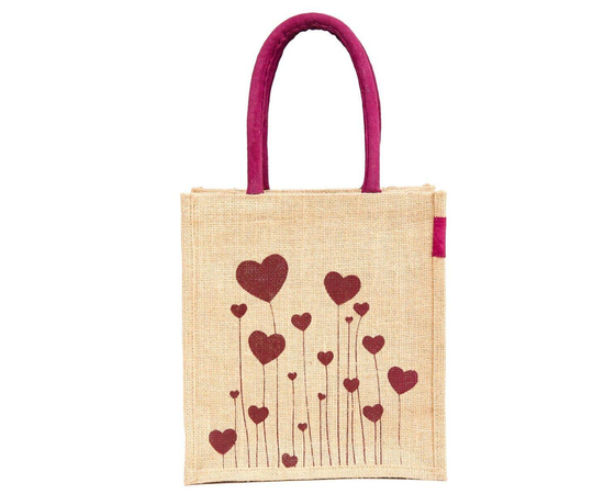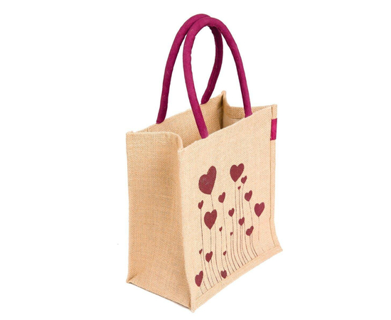 Jute handbag, Handmade Indian Jute Tote Bag, Reusable Carry Bag, tiffin bag, Hearts Printed, Eco-Friendly Tote, Shopper with handle, Waterproof, With Inner Compartments – ZIP, BOTTLE HOLDER, Indian Handicraft