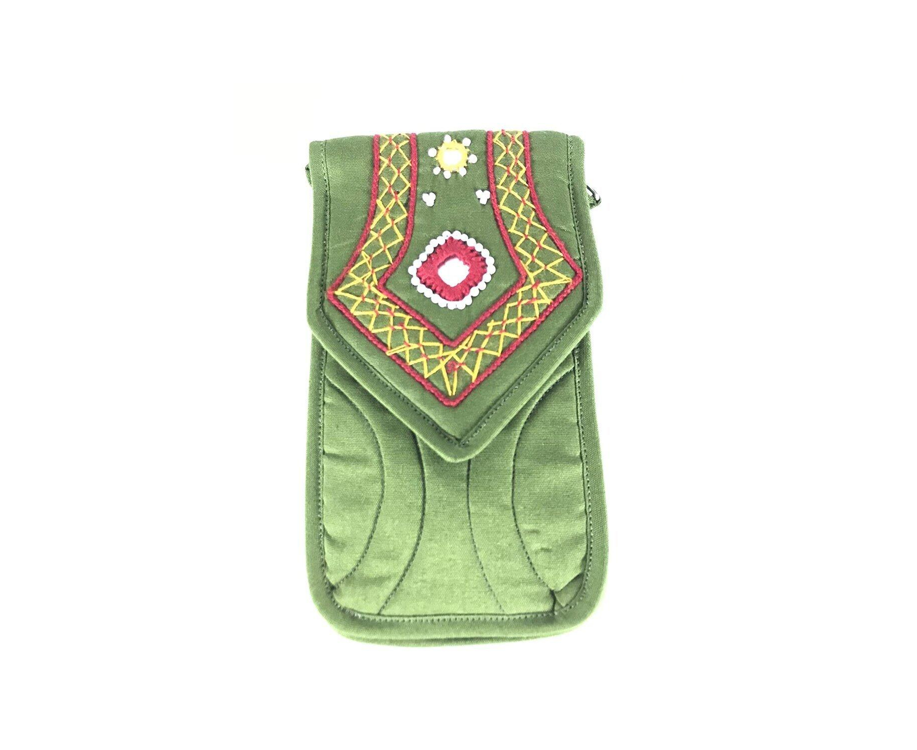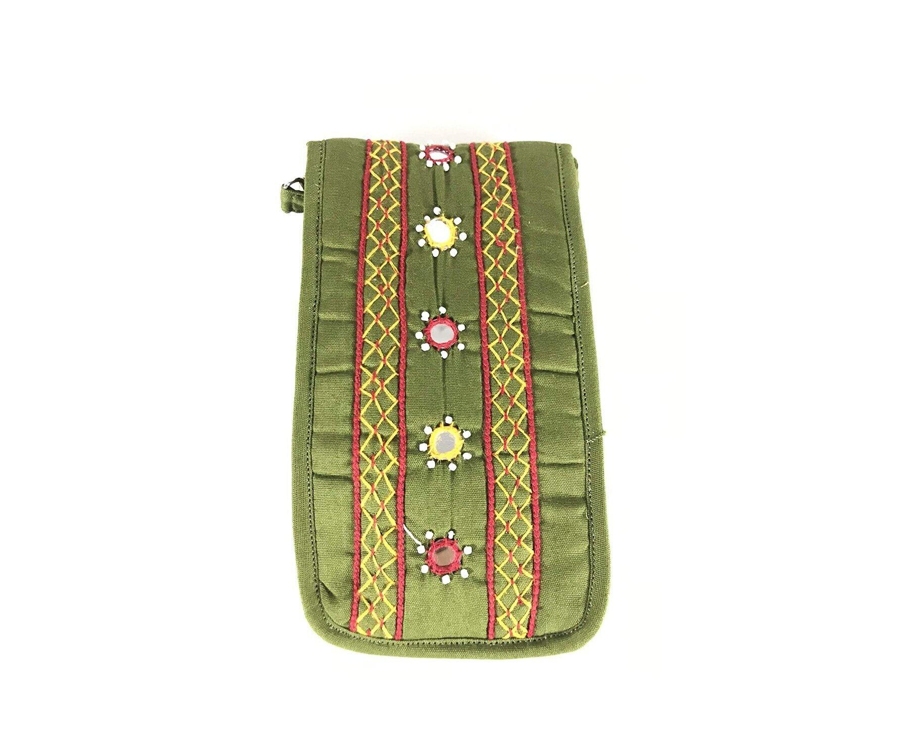 SriShopify Women Sling Smart Mobile Pouch, Banjara Traditional Bag, Cotton handmade Money Pouch (Small, Mirror, Beads and Thread Work Handcraft Purse, Mehendi Green), Designer handmade cellphone holder