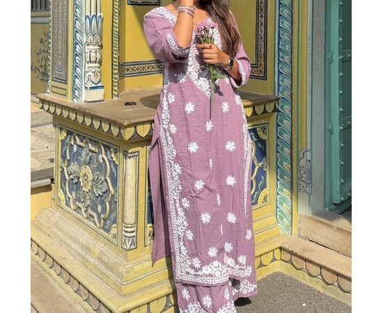 This beautiful kurti palazzo set is adorned with intricate Chikankari embroidery, adding a touch of elegance to your outfit. The comfortable palazzo pants and stylish kurti make it perfect for casual gatherings, parties, or festivals.