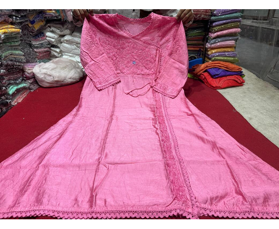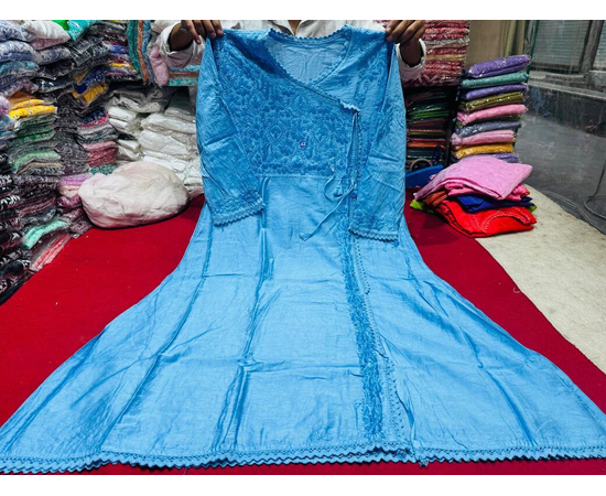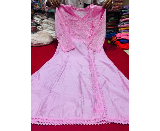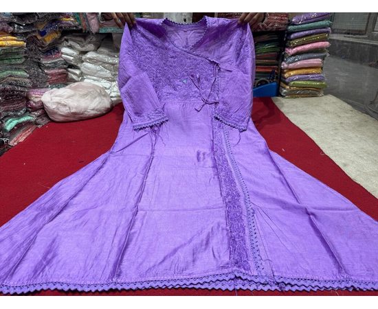 This dyeable Angrakha kurta is crafted from premium Chanderi Silk fabric and adorned with delicate hand-embroidered Chikankari work. The flowing Angrakha silhouette adds a regal charm, while the dyeable base allows you to personalize it in any color you desire. Perfect for festive wear, wedding functions, or elegant ethnic styling.
