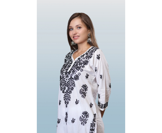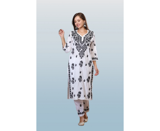 A dreamy black chikan kurti to elevate your style and elegance, Black and Chikankari are a perfect combination for creating an elegant style statement. The front of this kurti fully embroidered along with floral motifs and high collar neck with woven button and motifs placed on the sleeves and back also. This kurti will be a good choice for work wear or college wear. You can also carry this kurti to parties and get together .
