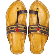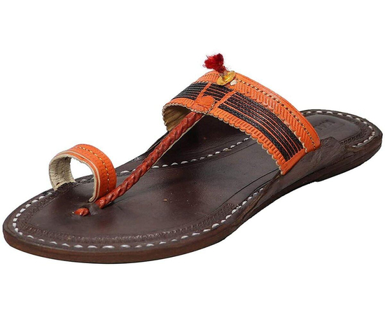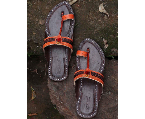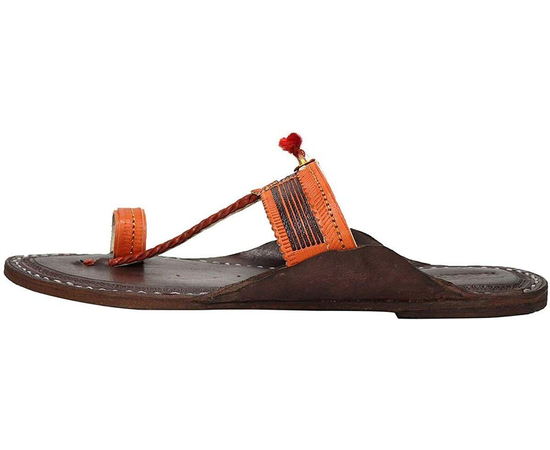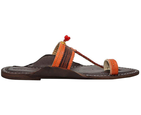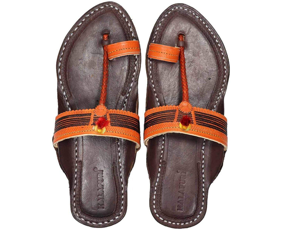 Kolhapuri Chappal in Export Quality Genuine Leather with Coffee Brown Pointed Shape Base and Traditional Orange Braids/Veni Upper. Handmade in Kolhapur for Women