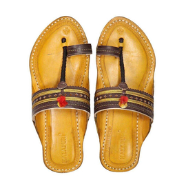 Kolhapuri Chappal in Export Quality Genuine Leather with Yellow Pointed Shape Base and Traditional Jari Lace on Brown Upper. Handmade