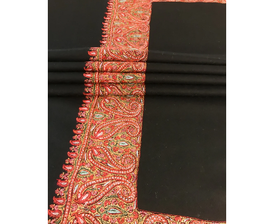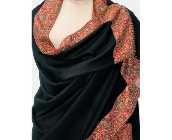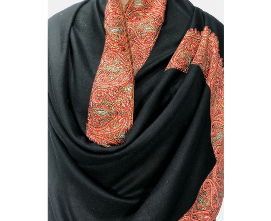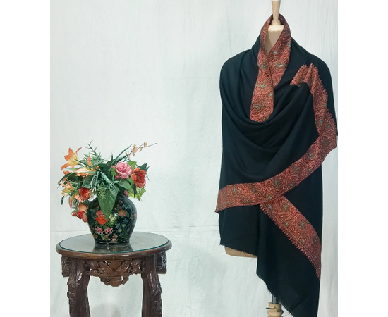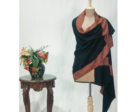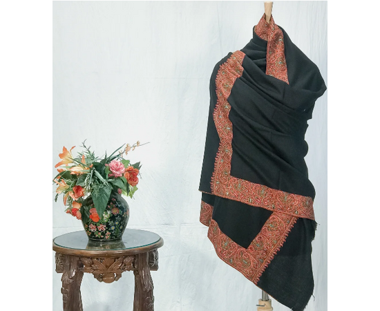 Put on the garment of Praise. We are giving out a versatile piece of art enhancing alluring Sozni embroidery. This Black Pure Pashmina Shawl With Sozni hand Embroidery will embrace your beauty in every way, as Kashmiri shawls are highly praised for their Fine Pashmina Wool, skilled weaving, and embroidery by master artisans of Kashmir item is made out of raw sheep wool, its course in nature but wearable, handmade items might carry certain irregularities that are part of its unique charm. This woolen wrap combines ancient royalty entwined with a fresh concept of a pashmina shawl