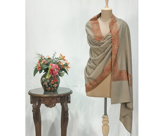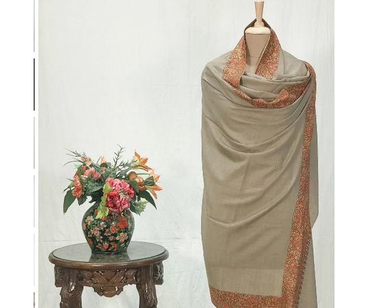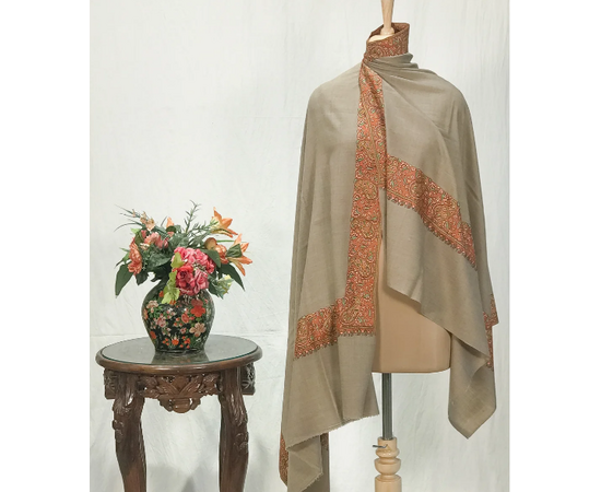 Put on the garment of Praise. We are giving out a versatile piece of art enhancing alluring Sozni embroidery. This Beige Pure Pashmina Shawl With Sozni hand Embroidery will embrace your beauty in every way, as Kashmiri shawls are highly praised for their Fine Pashmina Wool, skilled weaving, and embroidery by master artisans of Kashmir. These shawls are very warm with excellent pashmina fiber and beautiful designs adorned with adorable pashmina colors. Shawls are very very elegant and are made from the finest counts of Pashmina Fiber. The item is made out of raw sheep wool, its course in nature but wearable, handmade items might carry certain irregularities that are part of its unique charm. This woolen wrap combines ancient royalty entwined with a fresh concept to offer the ladies a majestic grace. This product is finished in attractive colors featuring Kashmir embroidery.