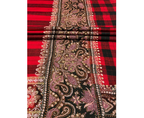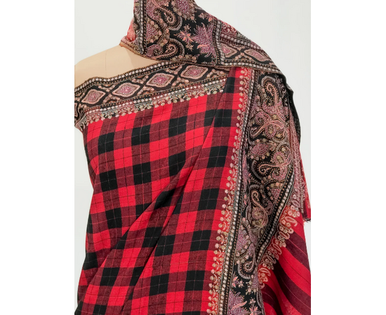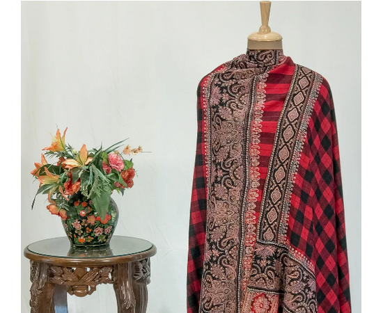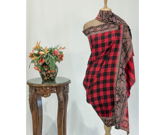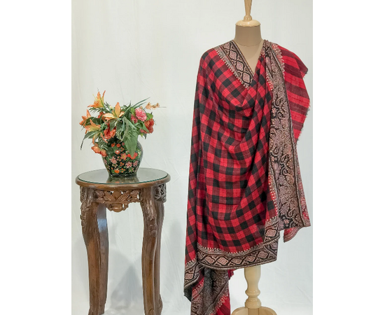Put on the garment of Praise. We are giving out a versatile piece of art enhancing alluring Sozni embroidery. This Red Checked Pure Pashmina Shawl with Sozni Hand-Embroidery will embrace your beauty in every way, as Kashmiri shawls are highly praised for their Fine Pashmina Wool, skilled weaving, and embroidery by master artisans of KashmiriThese shawls are very warm with excellent pashmina fiber and beautiful designs adorned with adorable pashmina colors. Shawls are very very elegant and are made from the finest counts of Pashmina Fiber. The item is made out of raw sheep wool, its course in nature but wearable, handmade items might carry certain irregularities that are part of its unique charm. This woolen wrap combines ancient royalty entwined with a fresh concept to offer the ladies a majestic grace. This product is finished in attractive colors featuring Kashmir embroidery