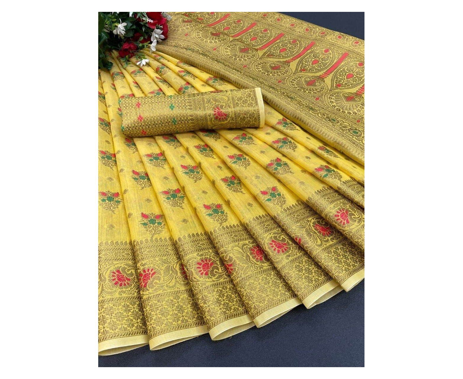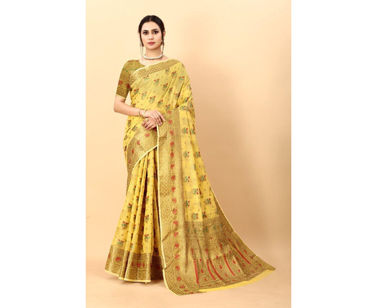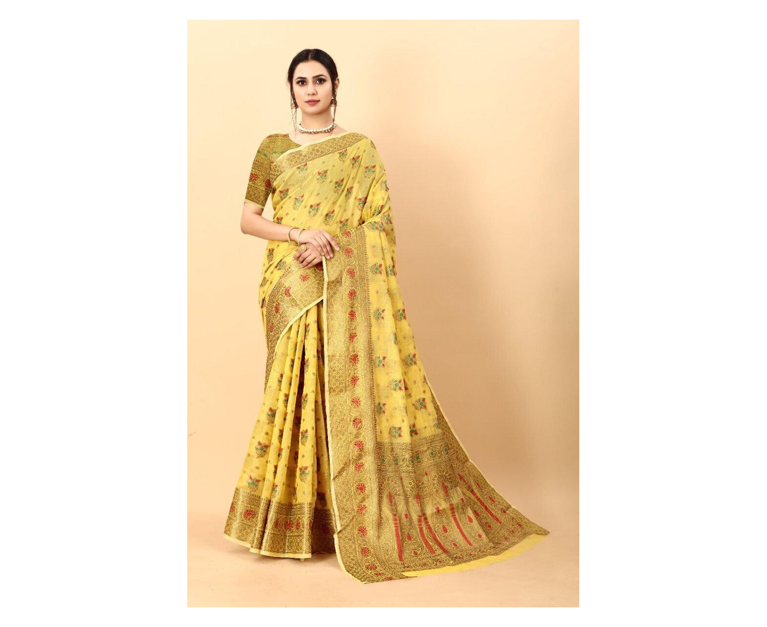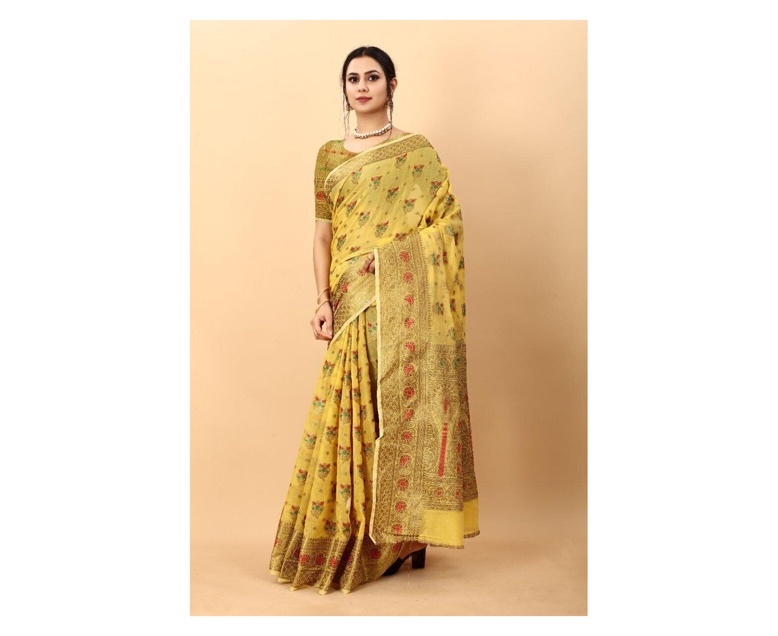 Soft Cotton Silk with meena weaving work saree and blouse for women, Indian saree, wedding saree, saree dress, designer saree, yellow sari, jacquard Stylish Golden - Zari Saree, Bridal Festival Sari