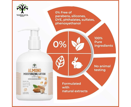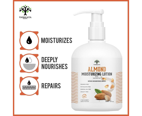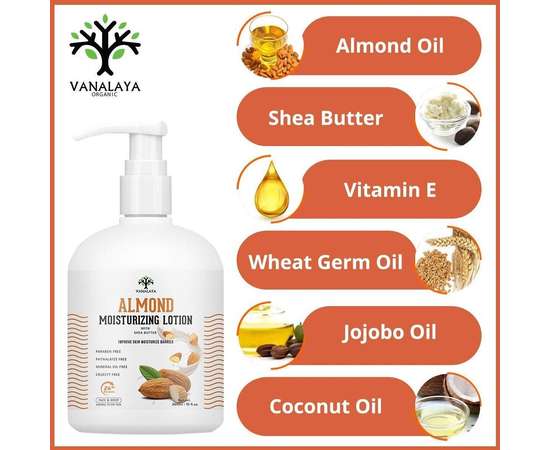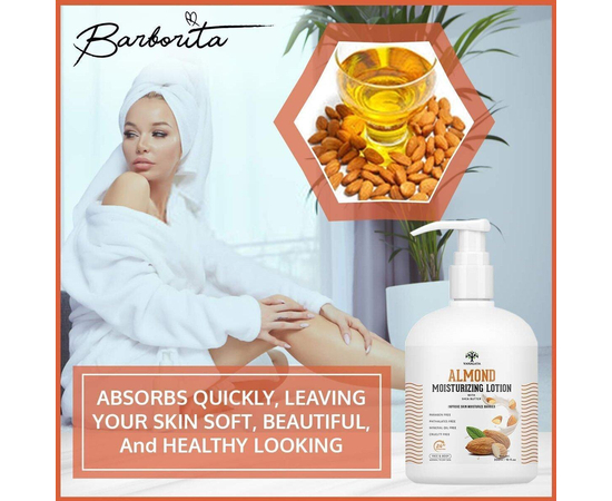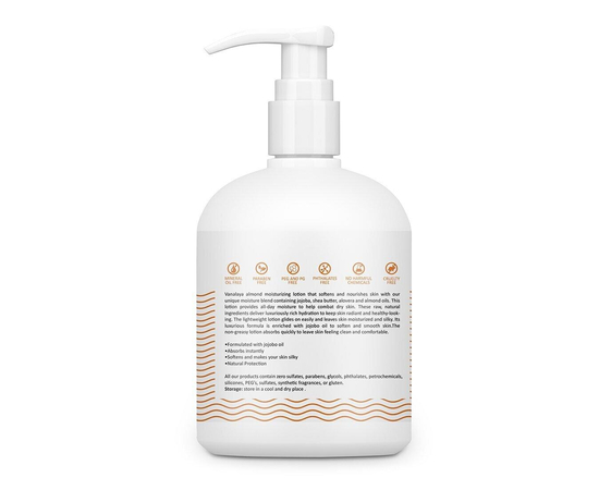 - ALMOND AND VITAMIN E MOISTURIZING LOTION: Almond oil soaks in quickly and is a powerful moisturizer, so it can be used on the face or body. Almond oil stimulates collagen. It is enriched with vitamin E which makes it great for both skin and hair