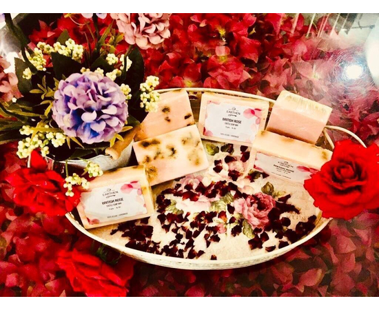 British Rose Castile soap bar fragrance pervaded with Castile. Best for sensitive skin, it has two layers with the rose petals embedded on one side and the powerful essence of British rose on the other, leaving your body with soothing British rose fragrance.