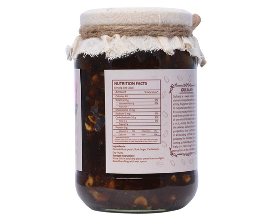 Gulkand is a sweet preserve of damask rose petals which has a strong fragrance. Often referred to roe petal jam which is prepared by using rose petals and sugar and then sundried over a period of one month thereby imparting a rich, dense, floral flavour to the delicacy.