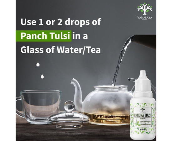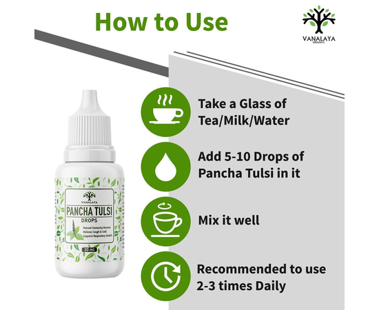 Mix 3-4 drops of Vanalaya Pancha Tulsi drops in a glass of hot water and consume 3-4 times a day or it can also be used with tea or juice.