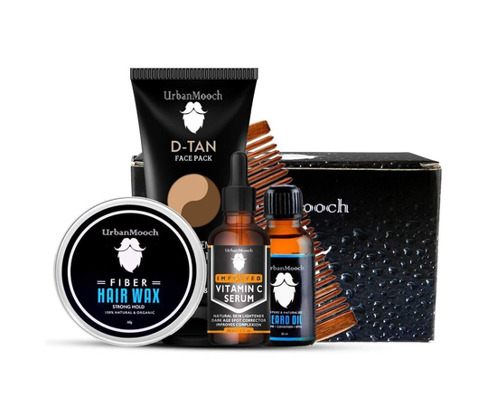 Urban Mooch Ultimate Face & Beard Grooming Combo Kit - Set of 5 | Beard Oil, Hair Wax, Vitamin C Serum, D-Tan Face Pack & wooden Comb | No Harmful Chemicals | Gift Pack