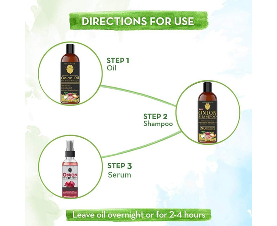 - Get strong and lustrous hair with this hair kit. This kit contains onion oil shampoo, onion oil serum and onion hair oil which helps to revive your tired scalp and hair