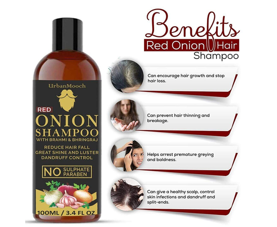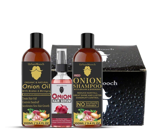 - Get strong and lustrous hair with UrbanMooch Ultimate Onion Oil Hair Kit. This kit contains Onion Oil Shampoo, Onion Serum and Onion Hair Oil which helps to revive your tired scalp and hair. Red onion extract aid in rejuvenating tired scalp and weak hair.