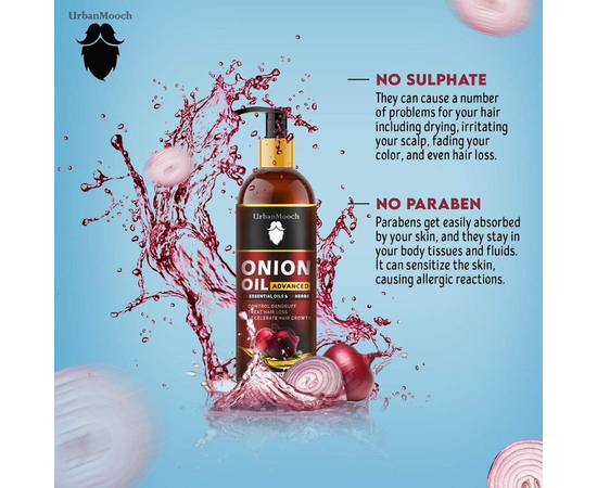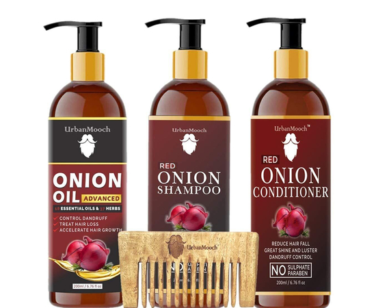 - Get strong and lustrous hair with UrbanMooch Ultimate Onion Oil Hair Kit. This kit contains Onion Oil Shampoo, Onion Oil Conditioner and Onion Hair Oil which helps to revive your tired scalp and hair. Red onion extract aid in rejuvenating tired scalp and weak hair.