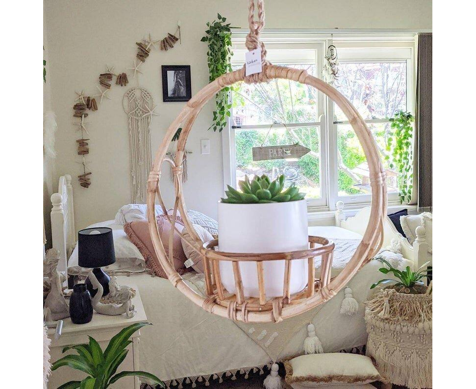 Display a potted plant in this Rattan Hanging Planter. It can be hung from the ceiling by the attached top ring or placed on a table or the floor. They can be used to add a bohemian/ Coastal vibe to your home or event. You can use them to hang your favorite plant babies.
