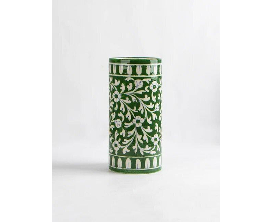 Intricate designBringing you tradition’s finest, this flower vase is intricately painted with swift and precise strokes, reflecting a sophisticated and elegant grandeur in your living spaces. Blue Pottery, locally known as kimchi, can be wielded by hand. Its designs reflect a series of geometric patterns & intricate floral designs. | Material that stands the test of timeHandmade to perfection, this vase is painstakingly made from ground feldspar mixed with gum or starch, making it more durable. The designs complement and accentuate your home with their shiny finish and everlasting luster. | Authentic handmade potteryGift your loved ones a reliable piece of tradition made by skilled artisans of Jaipur with an artisan card, a symbol of authenticity for pure handmade products. | Adorn Your Home DecorThis ceramic vase has designs that strike a balance between the traditional aspect and modern design. It blends well with any home design or aesthetic and also looks great anywhere on a counter or a tabletop. It is also easy to maintain, simply wipe it with a damp cloth. |