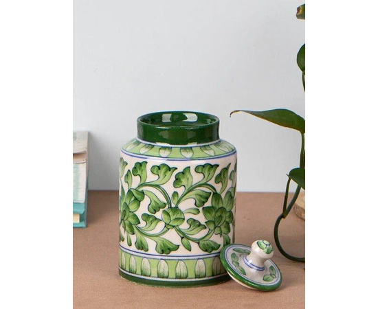 Intricate designBringing you tradition’s finest, this flower jar is intricately painted with swift and precise strokes, reflecting a sophisticated and elegant grandeur in your living spaces. Blue Pottery, locally known as kimchi, can be wielded by hand. Its designs reflect a series of geometric patterns & intricate floral designs. | Material that stands the test of timeHandmade to perfection, this vase is painstakingly made from ground feldspar mixed with gum or starch, making it more durable. The designs complement and accentuate your home with their shiny finish and everlasting luster. | Authentic handmade potteryGift your loved ones a reliable piece of tradition made by skilled artisans of Jaipur with an artisan card, a symbol of authenticity for pure handmade products. | Adorn Your Home DecorThis ceramic vase has designs that strike a balance between the traditional aspect and modern design. It blends well with any home design or aesthetic and also looks great anywhere on a counter or a tabletop. It is also easy to maintain, simply wipe it with a damp cloth. |
