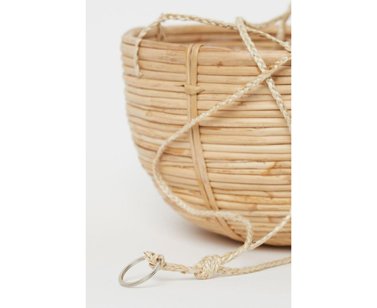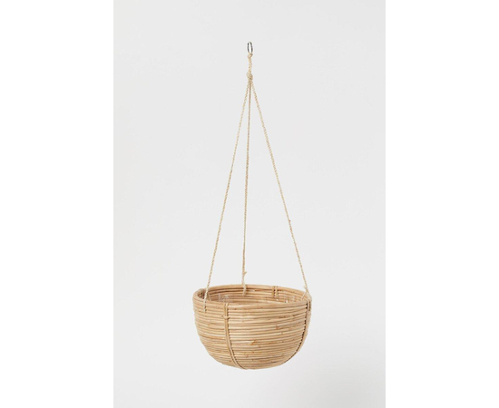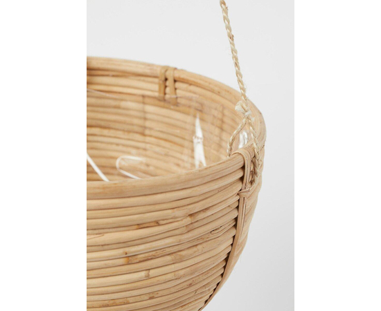 Large hanging basket in braided rattan with three cords and a metal ring at the top.