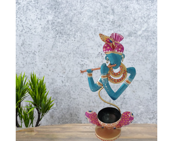 Lord Krishna Statue (Candle Holder) - Bring home the divine energy of Lord Krishna with a beautifully crafted iron statue. Perfect for gifting on religious occasions or for personal use as a centerpiece in your home temple. Krishna Playing Flute - This iron statue depicts Lord Krishna enchantingly playing his flute, symbolizing the divine music that can soothe any troubled soul. A meaningful and artistic gift for music lovers or those seeking inner peace.