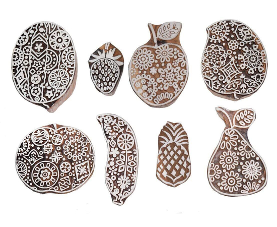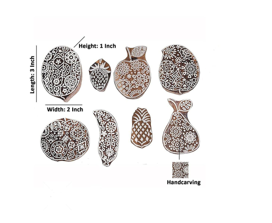 Handmade Fruits Design Block Print Wood Stamps - Wooden Blocks for Block Printing, Crafting, Saree Border Henna Fabric Textile Paper Clay Pottery ( Set of 8 Pcs )
