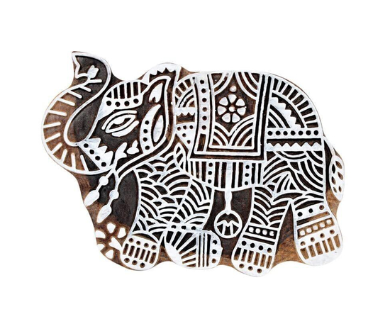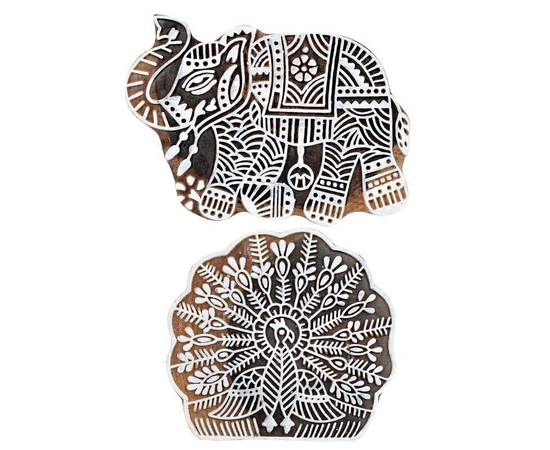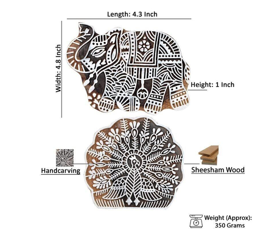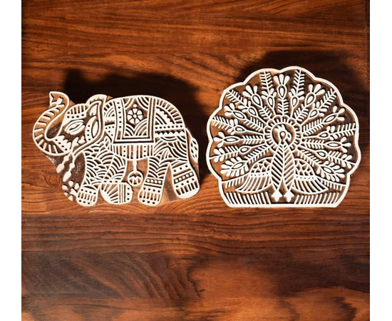 Handmade Elephant & Peacock Wooden Blocks Stamps for Fabric Saree Border Scrapbook /Art Crafts/Project Designing/Pottery/Tattoo Print/ Big Size/ 5 inches/ Set of 2