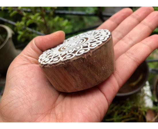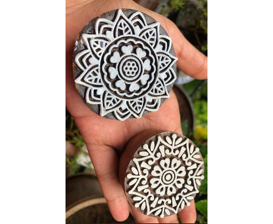Handmade Wooden Block Printing Stamps (Round Flowers) Hand Carved Stamps - Baren for Printing Fabric Saree Border/Fabric Textile Paper/Clay/Pottery Block