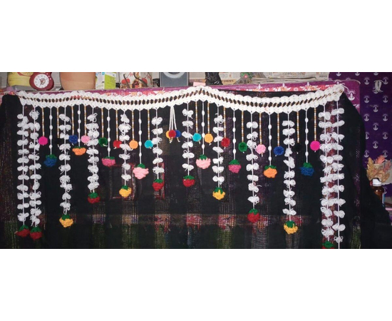 This is traditional decorative hanging known as Door Thoran/Toran. The origin of torans can be traced to Puranas (Hindu mythological work). Torans are used to decorate the main entrance of the home. The main idea behind decorating the homes is to please and attract the Goddess of wealth, Lakshmi. It is a handmade item. This can be hanged on doors as well as walls and can be used on many occasions like Pooja, Festivals, House Warming, Parties , Marriages and inaugurations.