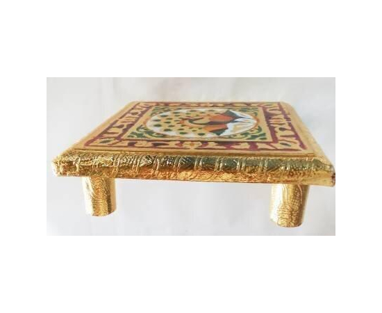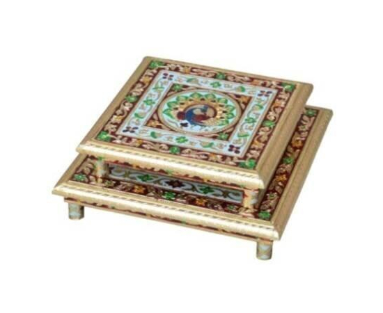 Made Of high-quality wood and embossed Meenakari artwork, this chowki is ideal for both home decor and gifts. Beautifully handcrafted by the skilled artisans, this square wooden choki is a nice choice for any occasion. It can be maintained easily by dusting with a soft cloth or brush. With fine Meenakari handwork on wooden, this chowki is the best quality product to use. It adds a touch of positive energy power and calmness to your room with its shiny appearance. Regional specialty for Rajasthan, this chowki is used as offering a seat to the lords and worship gods in India.
