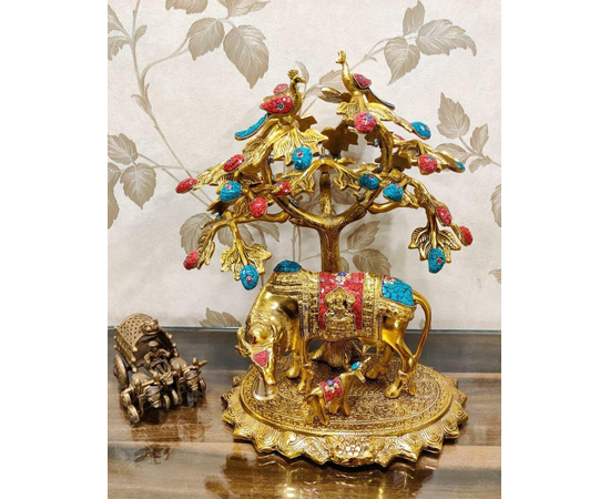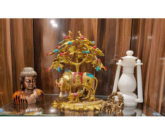 The epitome of motherly love, this Kamdhenu cow of the gow feeding its baby is the symbol of true motherly love and affection. The metal figure is placed on a base. Beautiful creation of Kamdhenu cow and calf is a perfect symbol of the undying aura of the holy saint that encompasses numerous devotees round the globe. This statue conveys the emotion of people who consider cow(gomatha) as a mother figure.