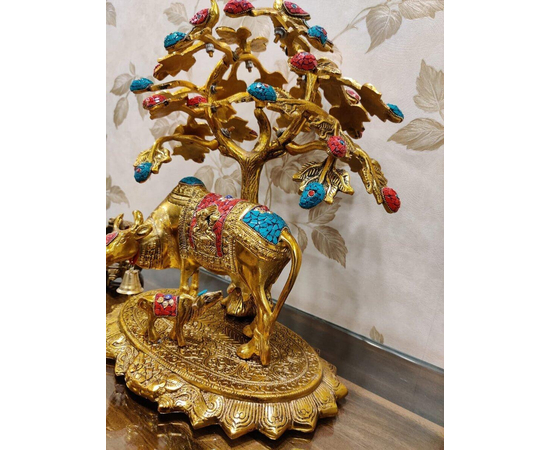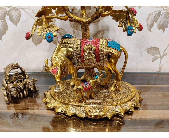 Lord Krishna's Kamdhenu Cow with Calf and krishna brass like metal Showpiece for Home Decor and Decorative Gift Item Gold big .