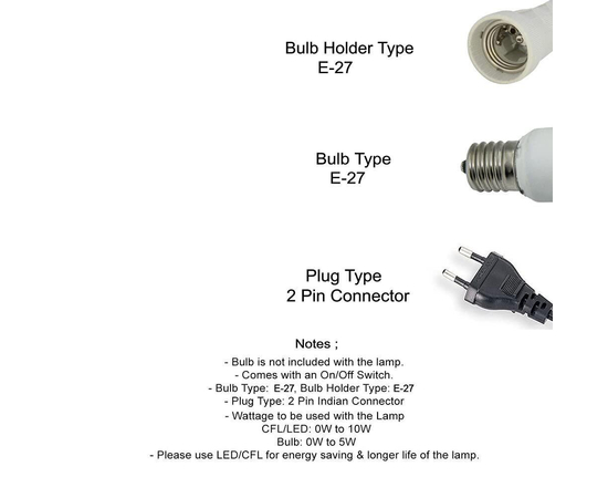 - Note: ( "BULB IS NOT INCLUDE WITH THIS PRODUCT" ) The bulb and the holder type B-22, the plug type is 2 pin plug, Wattage to be used with the Lamp CFL/LED: 0W to 10W, Bulb: 0W to 10W.