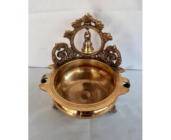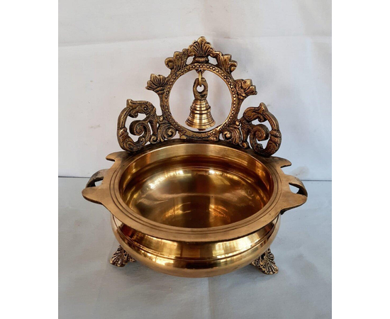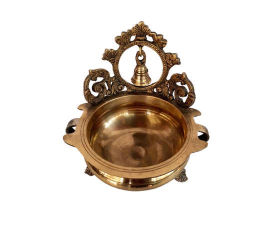Ethnic Carved 7 Inches Brass Decor Urli Bowl with Bell, 1 Piece, Golden