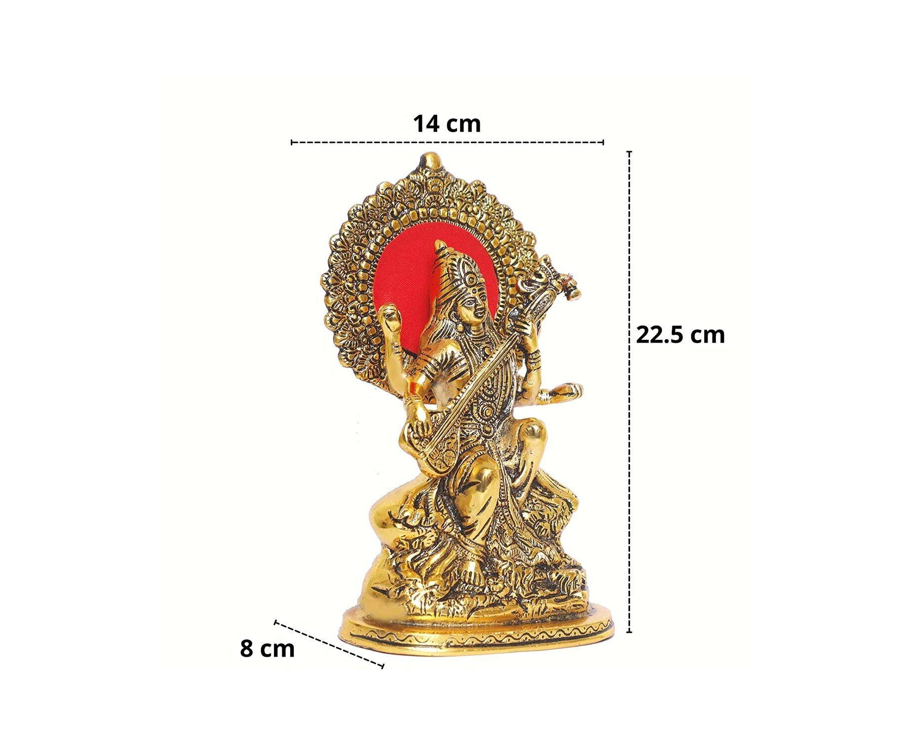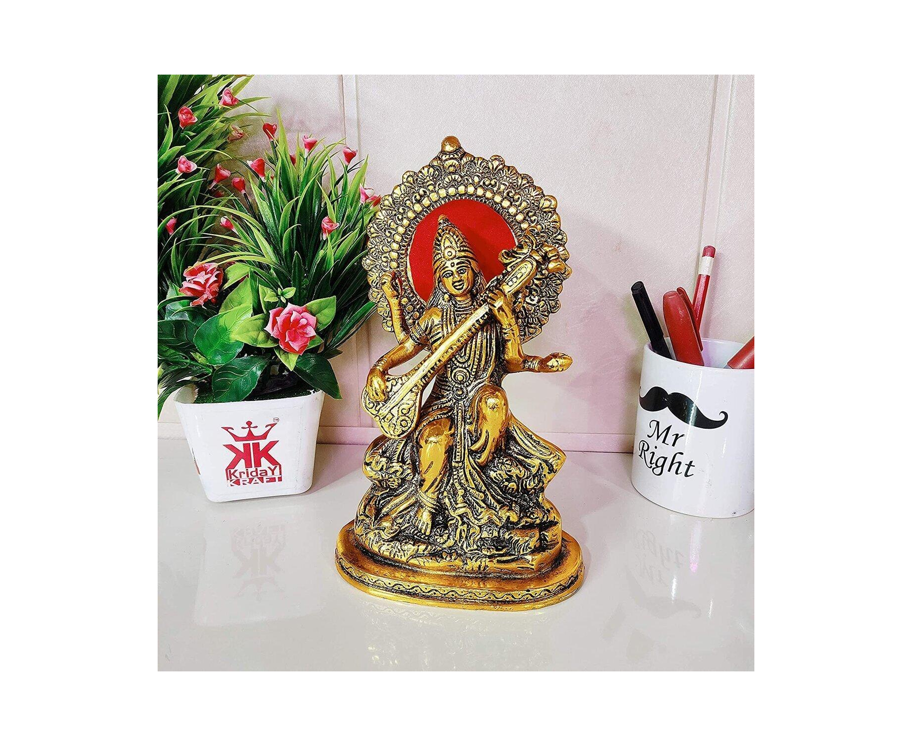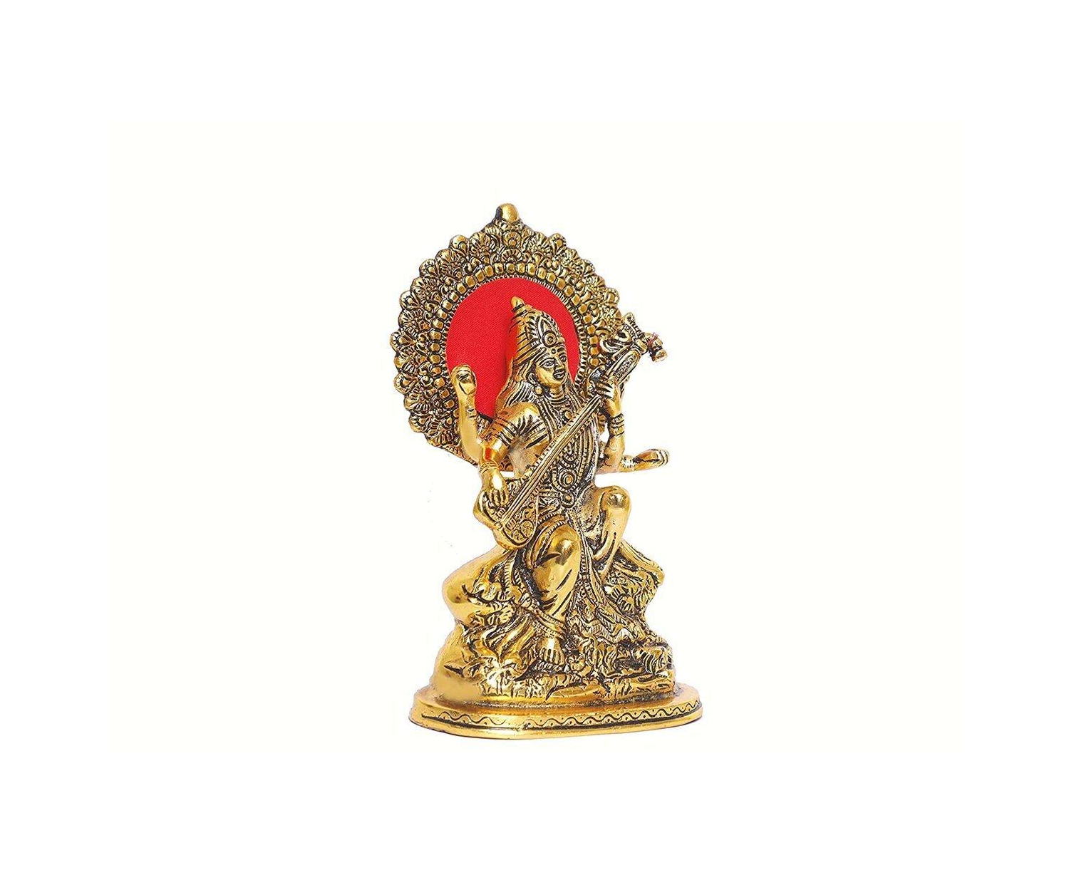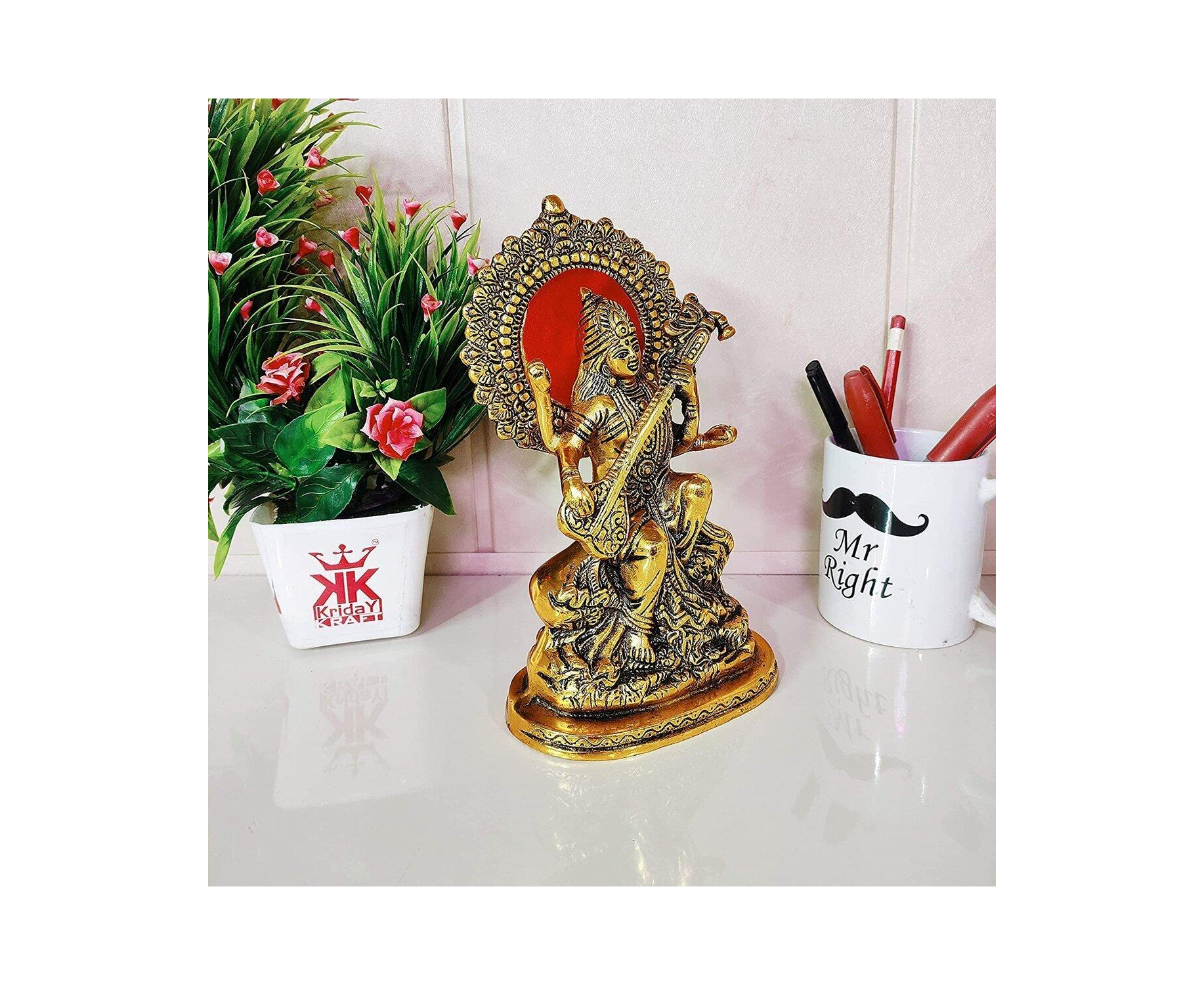 Gold Plated Maa Saraswati Metal Statue, Hindu Goddess Saraswati ji Murti for Pooja Meditation Office Home Study Table, Decorative Showpiece Figurines, Religious Idol Gift Article