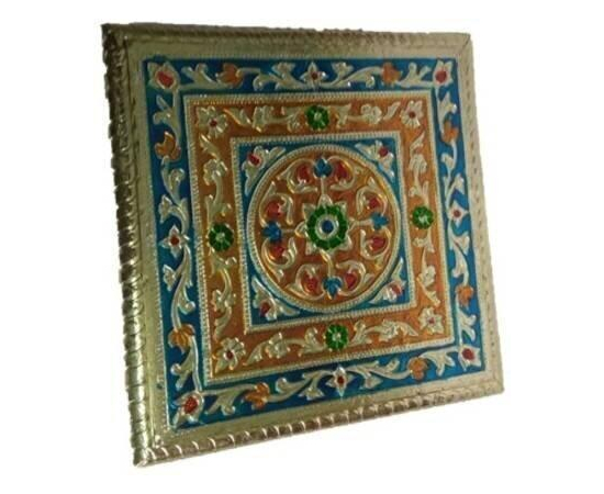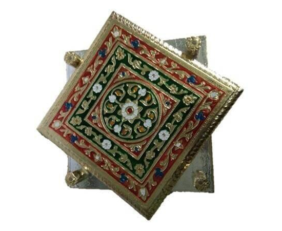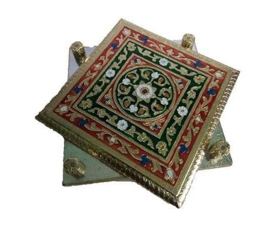 Made Of high-quality wood and embossed Meenakari artwork, this chowki is ideal for both home decor and gifts. Beautifully handcrafted by the skilled artisans, this square wooden choki is a nice choice for any occasion. It can be maintained easily by dusting with a soft cloth or brush. With fine Meenakari handwork on wooden, this chowki is the best quality product to use. It adds a touch of positive energy power and calmness to your room with its shiny appearance. Regional specialty for Rajasthan, this chowki is used as offering a seat to the lords and worship gods in India.