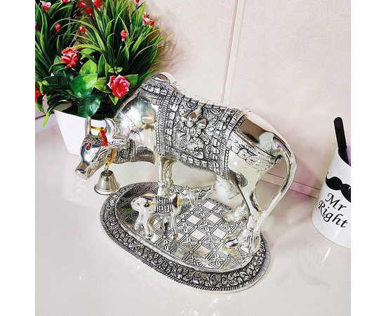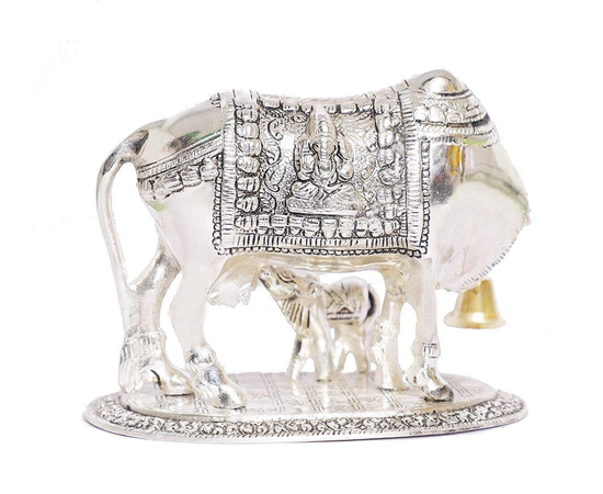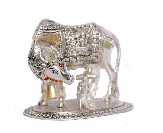 Indian Kamdhenu Silver Finished Metal Cow and Calf Figurine/Cow With Calf Idol/ Good Luck Cow/ Animal Figurine/ Spiritual Showpiece