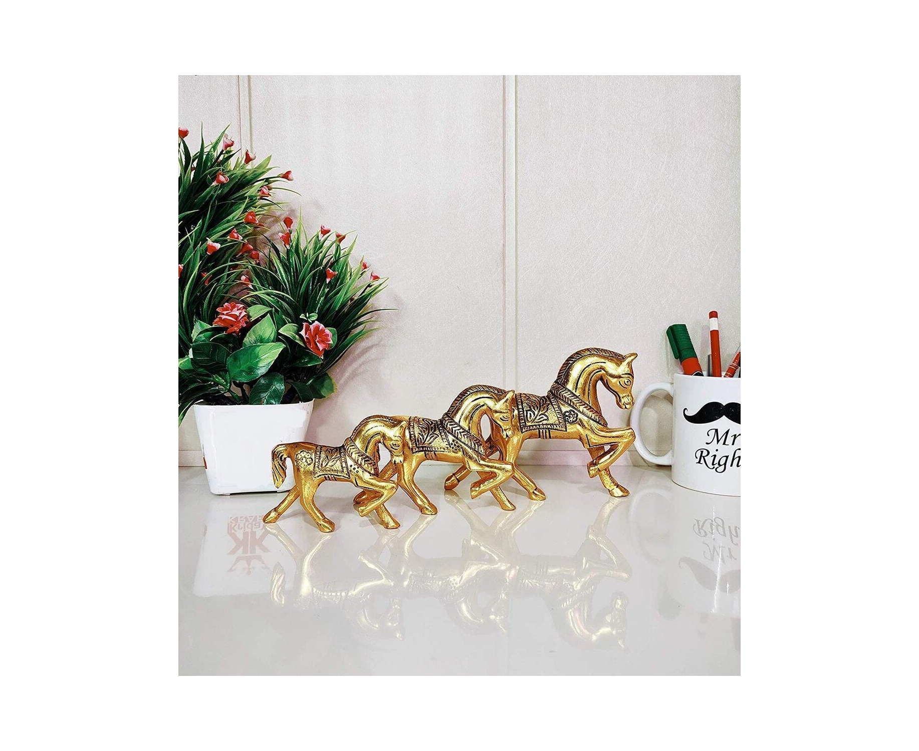 Metal Golden Finish Horse Set. Horse Set is gold plated with an antique finish so looks very beautiful and use for the purpose of worship and for home decorative. It's designed to looks traditional stylish and inspiration from the day's of royal touch, that is made in white-metal casting with gold antiques finish, white metal to bring elegance to your home.