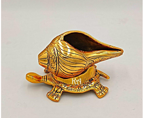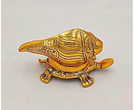 This beautiful handcrafted antique metal Shankh on tortoise is ideal for keeping in home and office as a sign of prosperity. A Shankha is a conch shell of ritual and religious importance in Hinduism and Buddhism. In Hindu mythology, the shankha is a sacred emblem of the Hindu God Vishnu. It is still used as a trumpet in Hindu rituals such as laxmi pooja, ganesh pooja, durga pooja, navratri pooja, etc, and in the past was used as a war trumpet. The shankha is praised in Hindu scriptures as a giver of fame, longevity and prosperity, the cleanser of sin and the abode of Lakshmi, who is the goddess of wealth and consort of Vishnu. The shankha is one of the eight auspicious symbols of Buddhism, the Ashtamangala, and represents the pervasive sound of Buddhism. The detailed carving on the shankh captures the essence of the Indian Hindu mythology. Placed on the back of the auspicious Tortoise it is believed to bring luck, fame, and prosperity. You can keep this Shankh for pooja in your house or office or you can gift it to someone who has started a new venture, or it can be given as a souvenir on any special occasion.