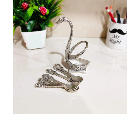 Metal Swan (Duck) Silver Spoon Stand for Dining Table/ 6 Pc Spoon Set with Stand/ Decorative Spoon Rest Showpiece Item for Dining Table