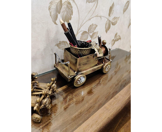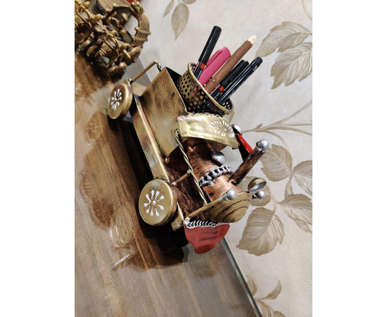 Add an artistic touch to your office or home space with this hand carved engine shaped metallic pen holder. Intricate designs that create a beautiful piece of art, this pen stand is ideal as an ornamental cum utility piece for any Desk/ Office or Workspace. This stationary pen holder is perfect for storing things in your cubicle, home, or study table. It helps you keep the stuff you need at your fingertips, pens, pencils, and markers now have a place to call home or at your cubicle. The pen organizer's bottom is secured with a non-slippery surface to keep your desk organizer from sliding around. Its shiny color adds a stylish feel to your desk home or in the office. Ideal for gifting to family, friends or as a corporate gift.