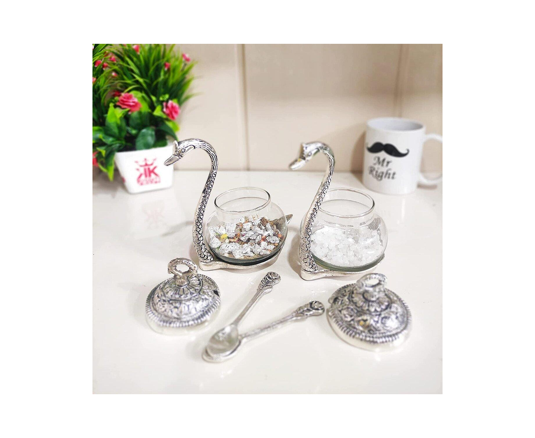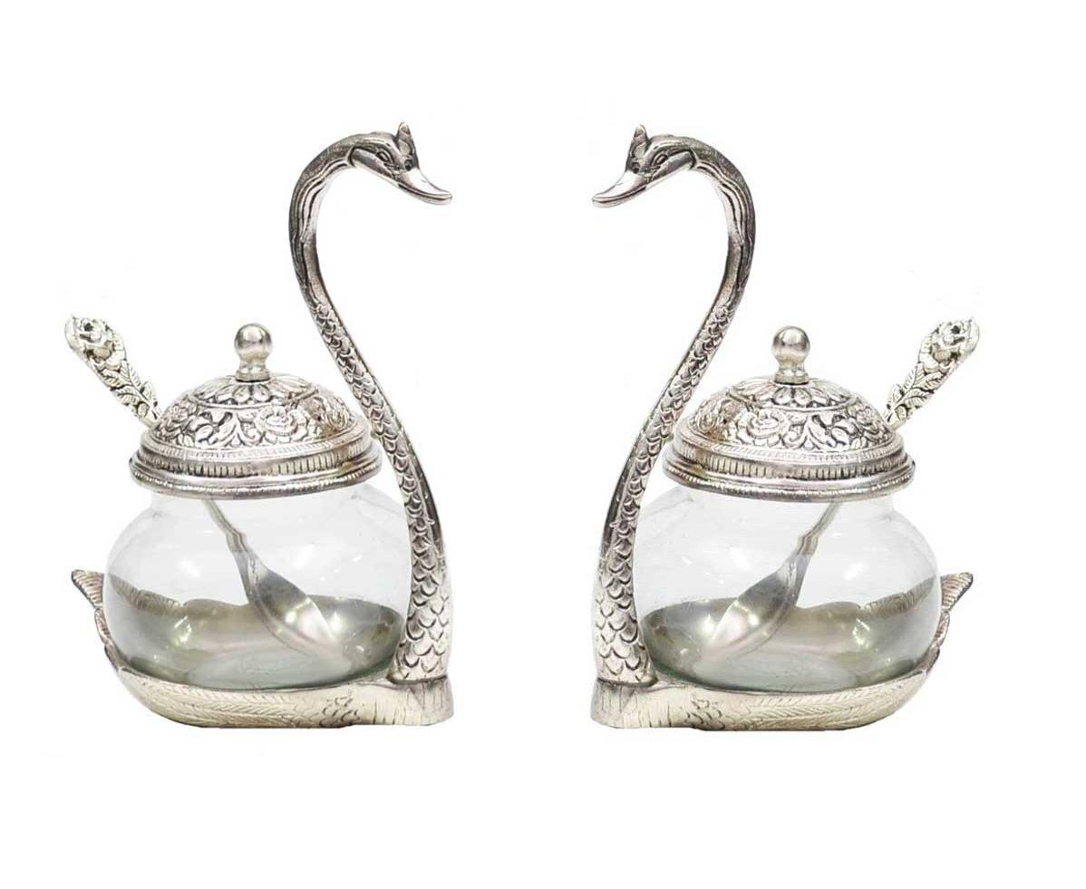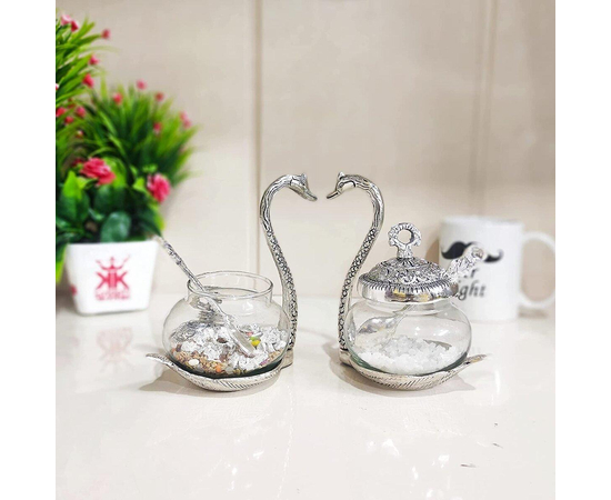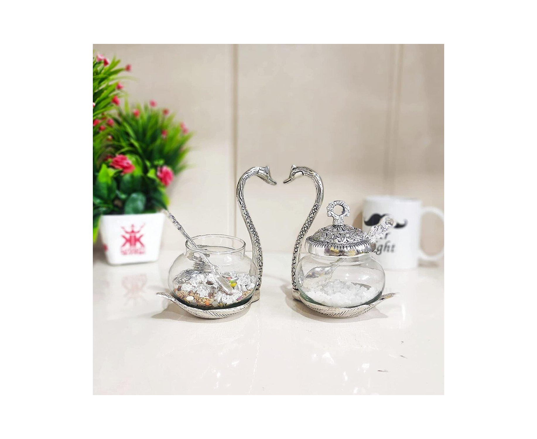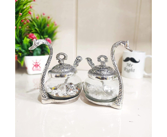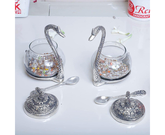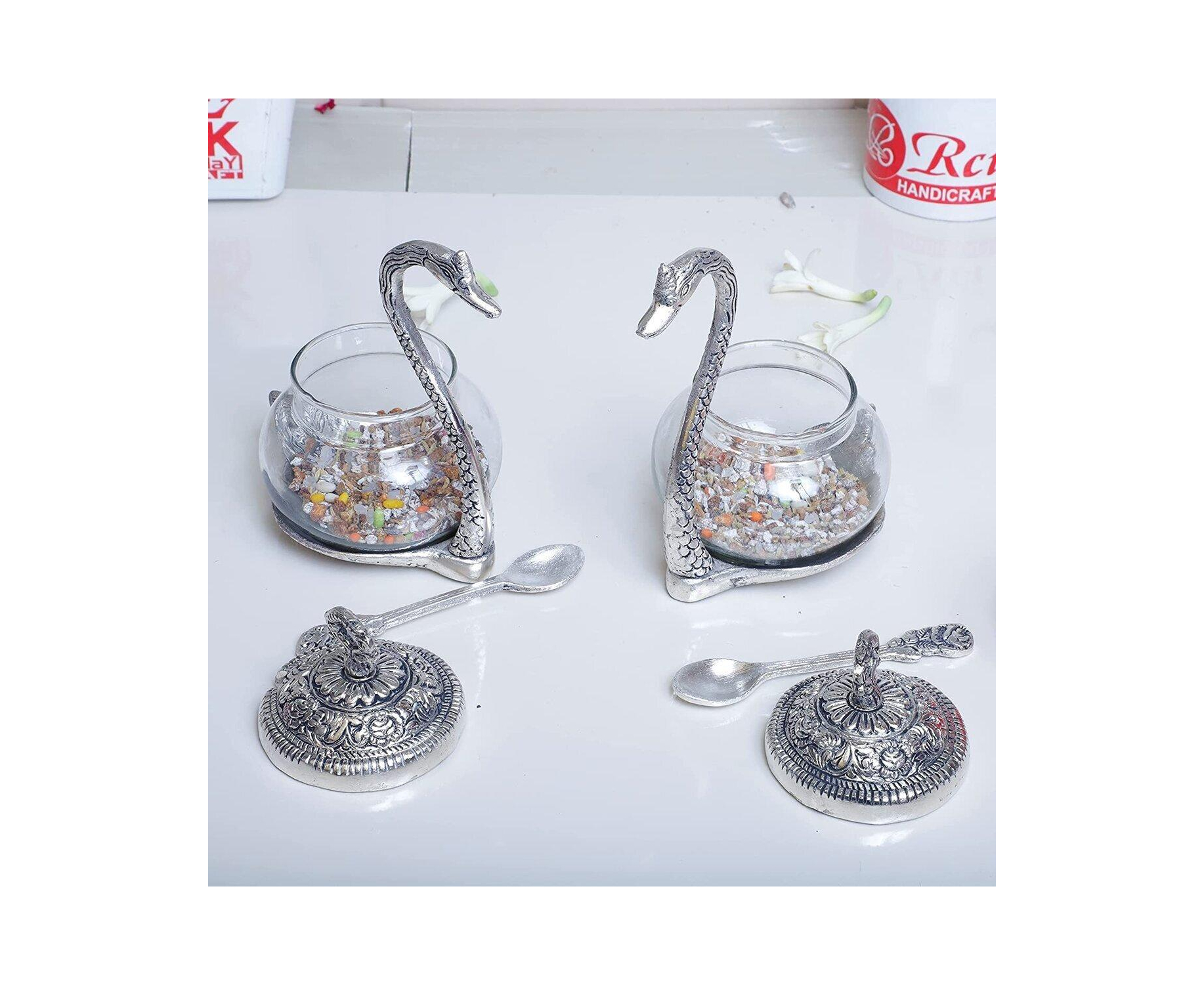 • Product contains: 2 Peacock Shaped Glass bowl with 2 spoons and 2 cover Product Dimension: Length: 12 cm. Height: 15 cm. Width: 10 cm. , Colour: Transparent Glass Silver Table DÃcor Handicrafts suf supari bowl for table duck bowl metal