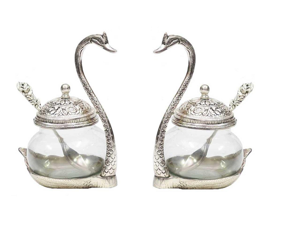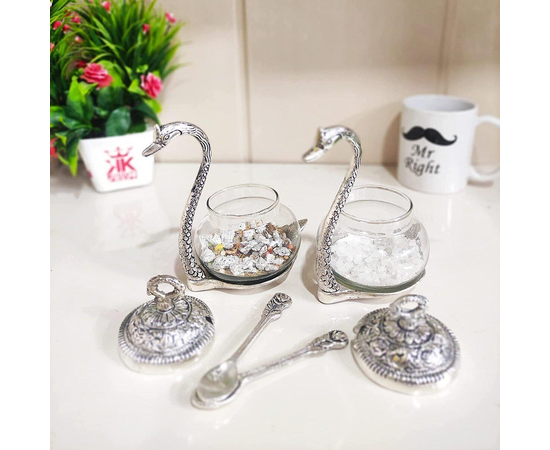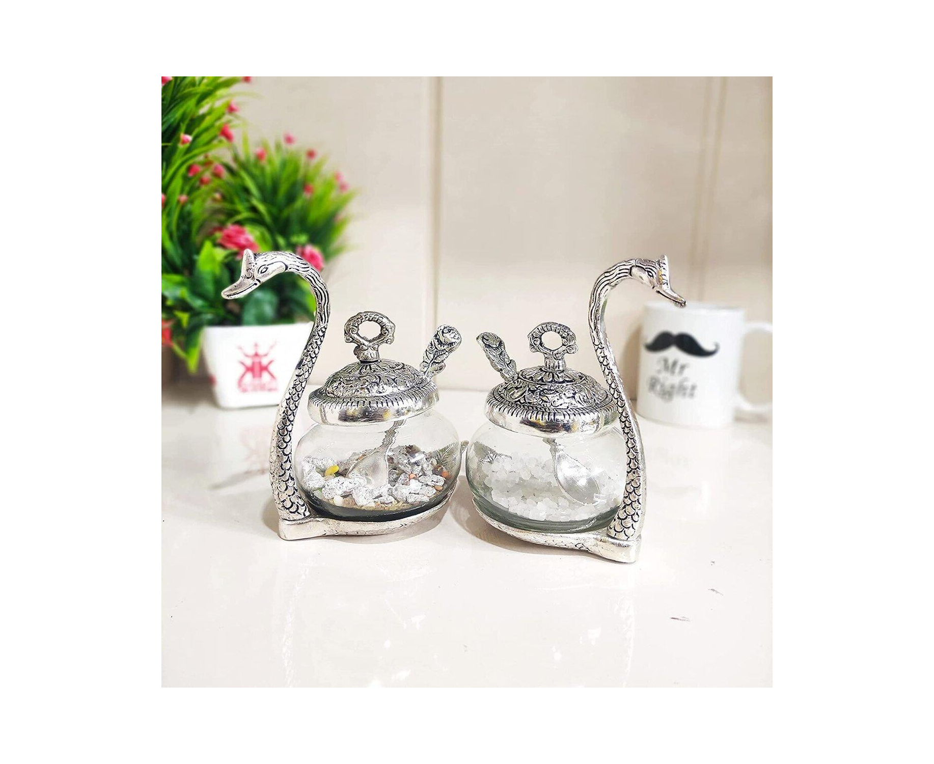This Duck Shaped Bowl With Spoon Has A Textural Expanse And Will Beautifully Complement Opulent Interiors And Serving Table Of Your Home Or Office. It Can Also Serve As A Great Gifting Option For Various Occasions. Container Glass Color Is Subject To Availability. Enlighten your home with this auspicious Peacock Shaped Multipurpose Jar made from Metal And Glass which reflects artistic brilliance and adds elegance to your decor. Style your home and office with this Peacock Shaped Multipurpose Jar sure to be admired by your guests. It serves as a great gift, especially around religious celebrations and festivities. This white metal handicraft has been made by skilled artisans. Crystal Mouth Freshener Container is a multi-utility item, with beautiful metal decorative work. Use it for storing mouth fresheners or for decorative purposes or to keep your tidbits.