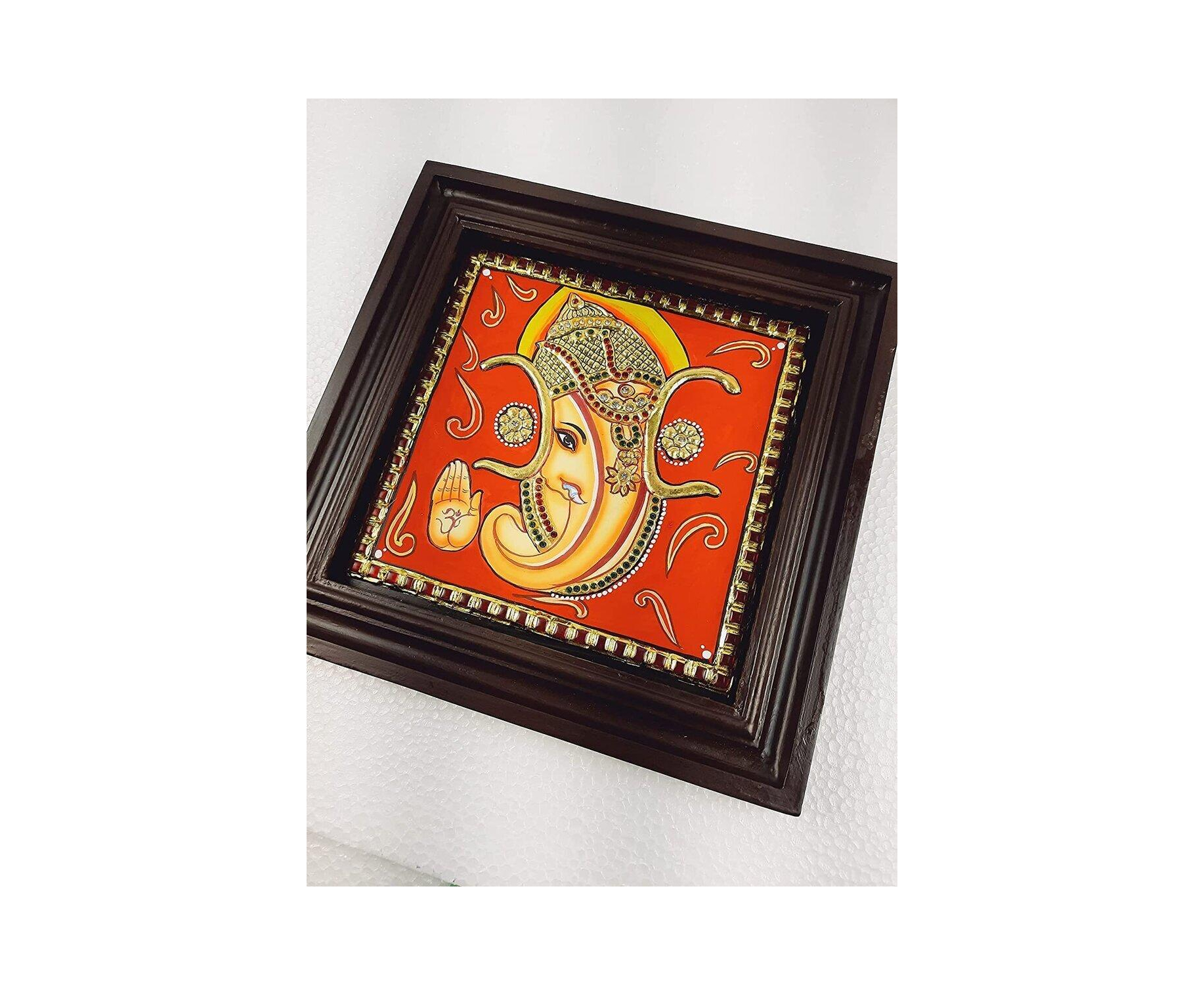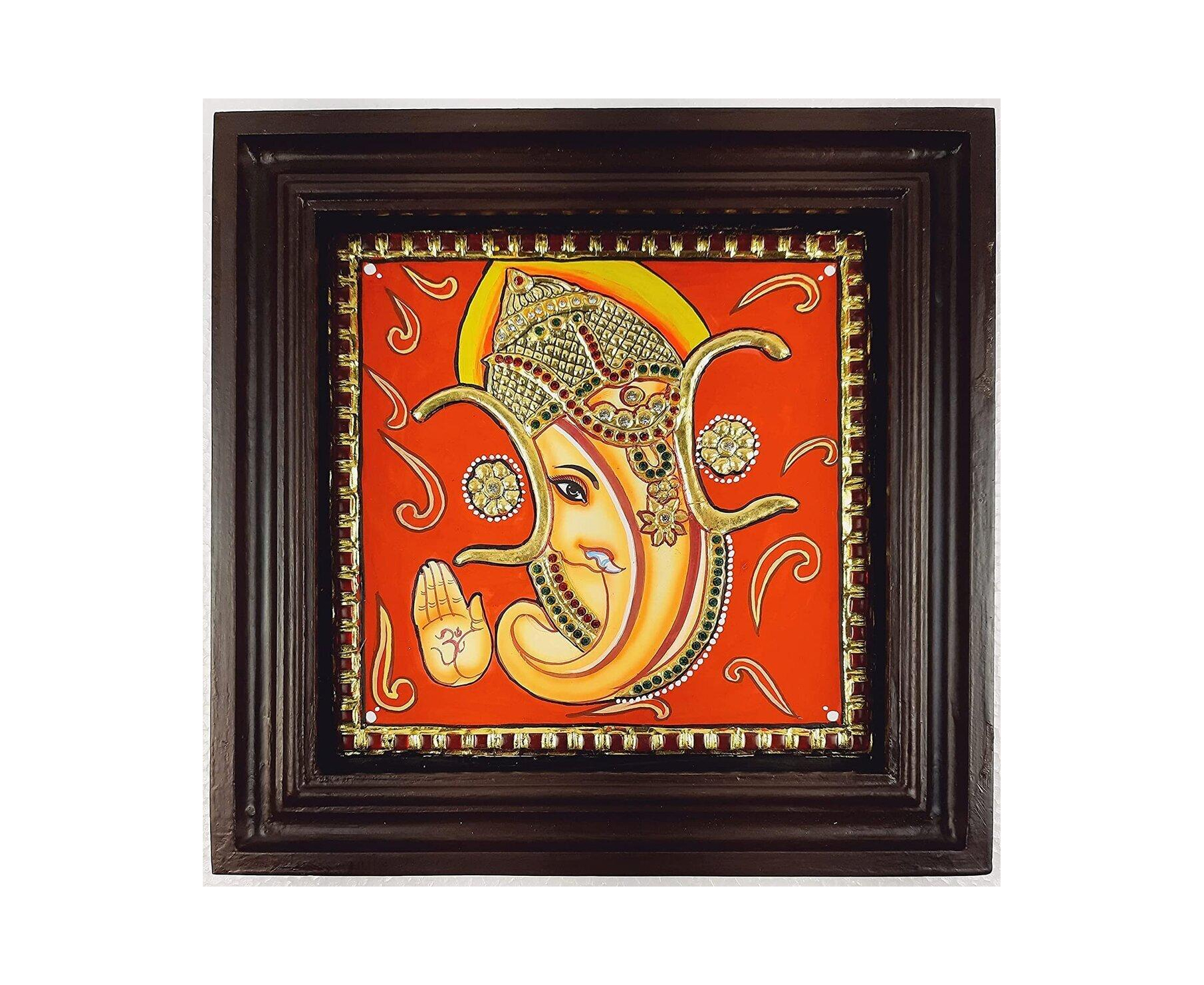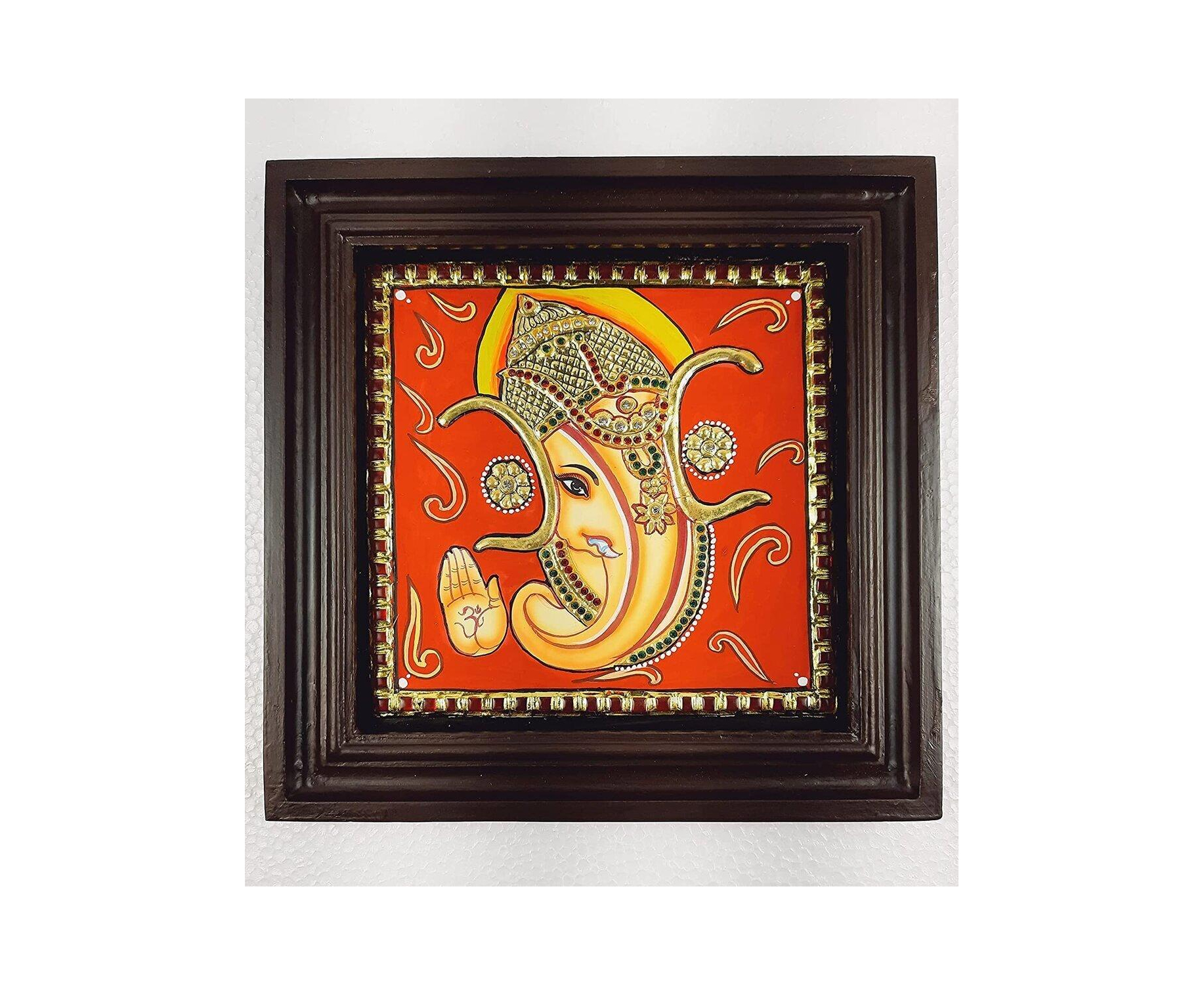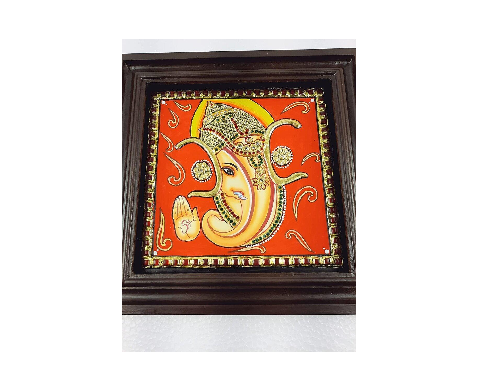 Ganesha Tanjore Painting, Lord Ganesha Indian Handmade Embossed Painting with Wooden Frame for Wall Decor, Room Decor, Gift Items