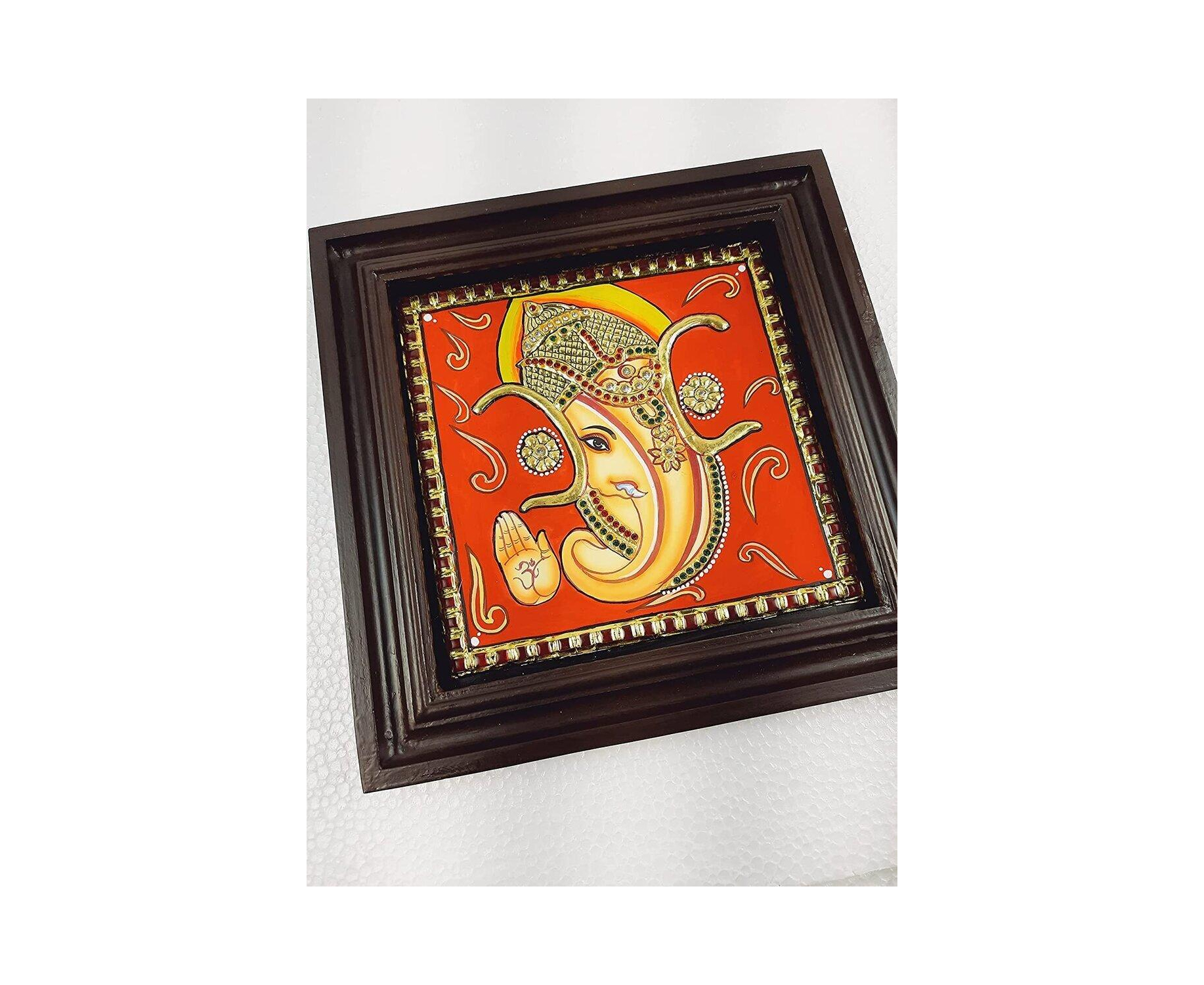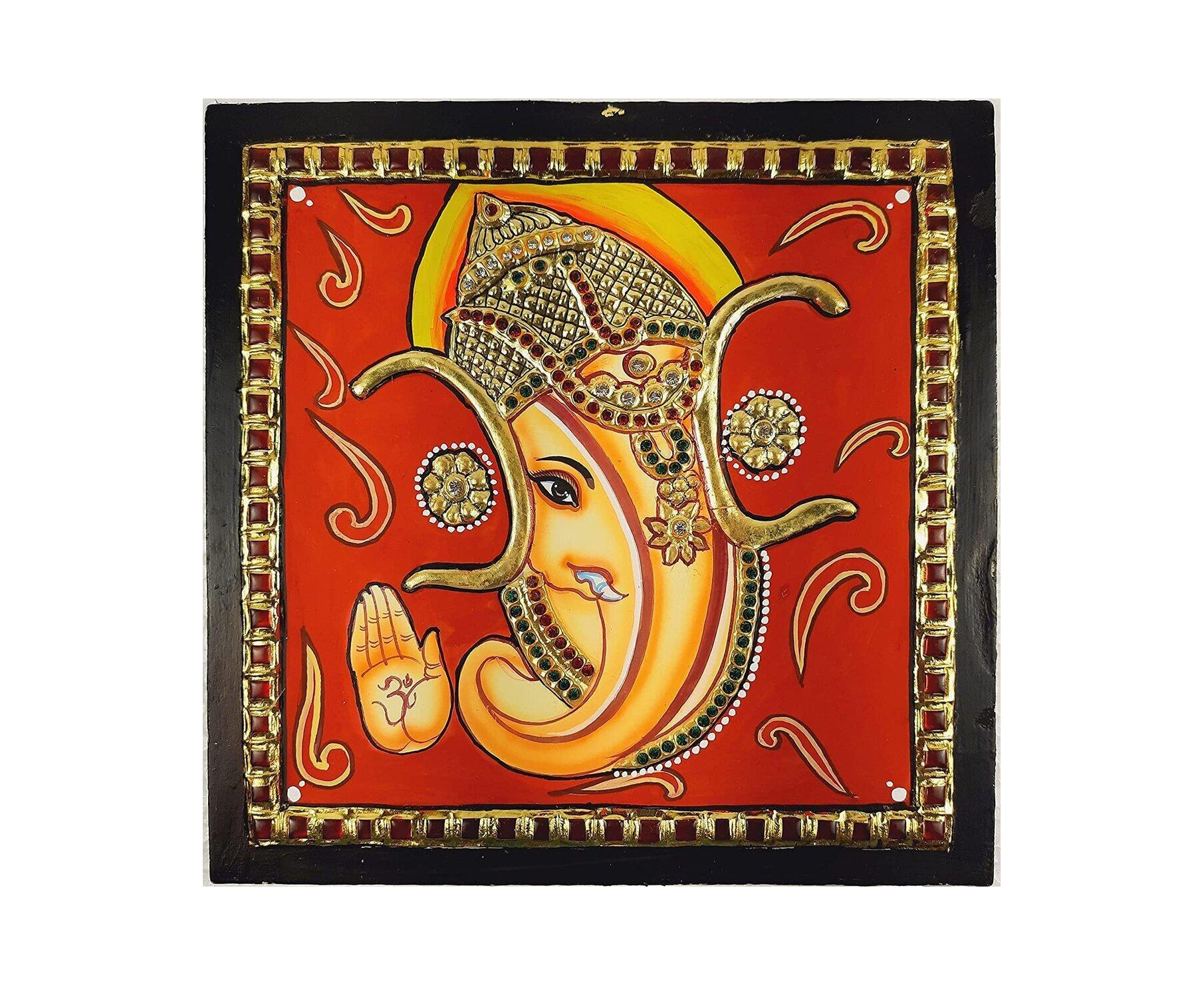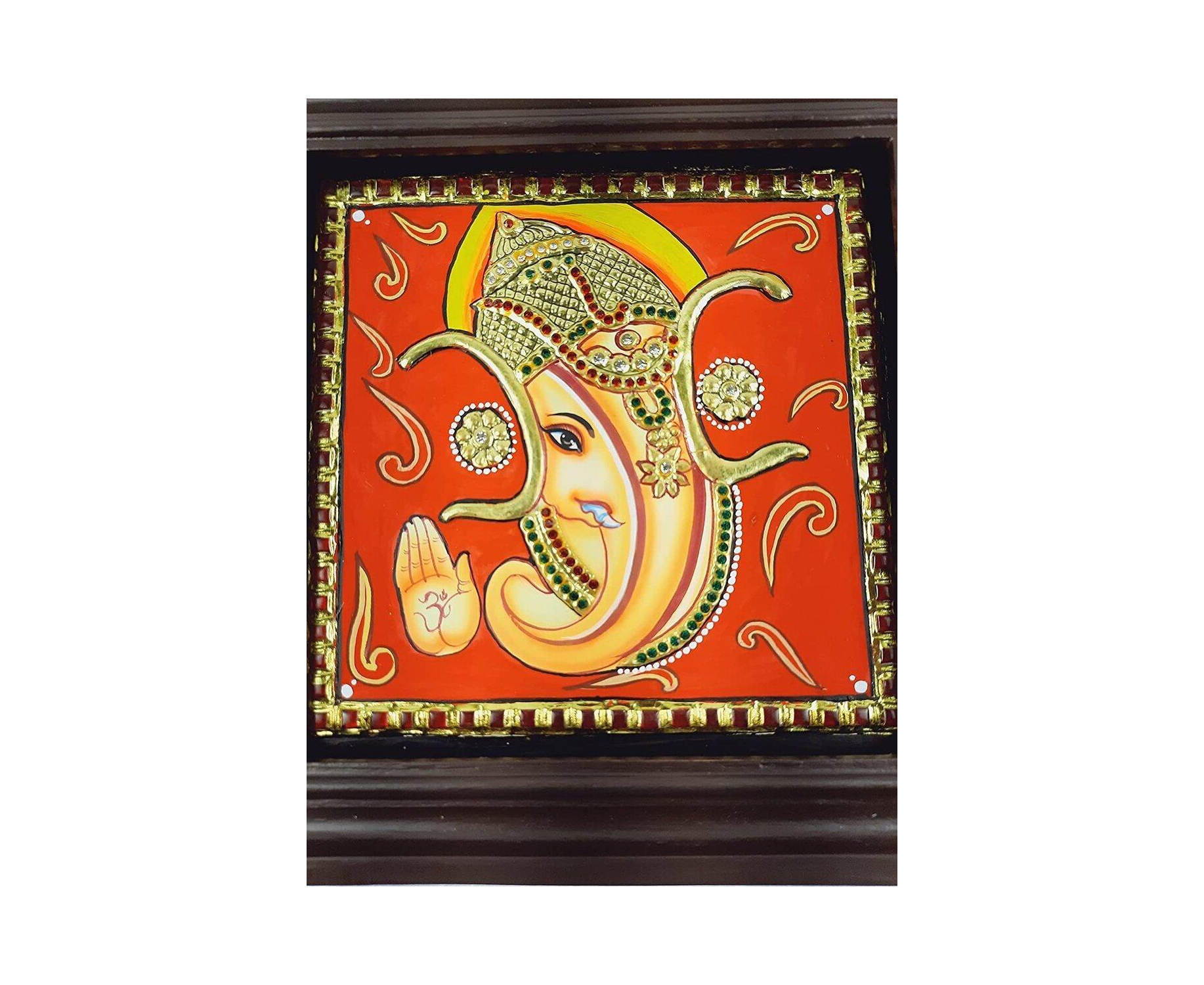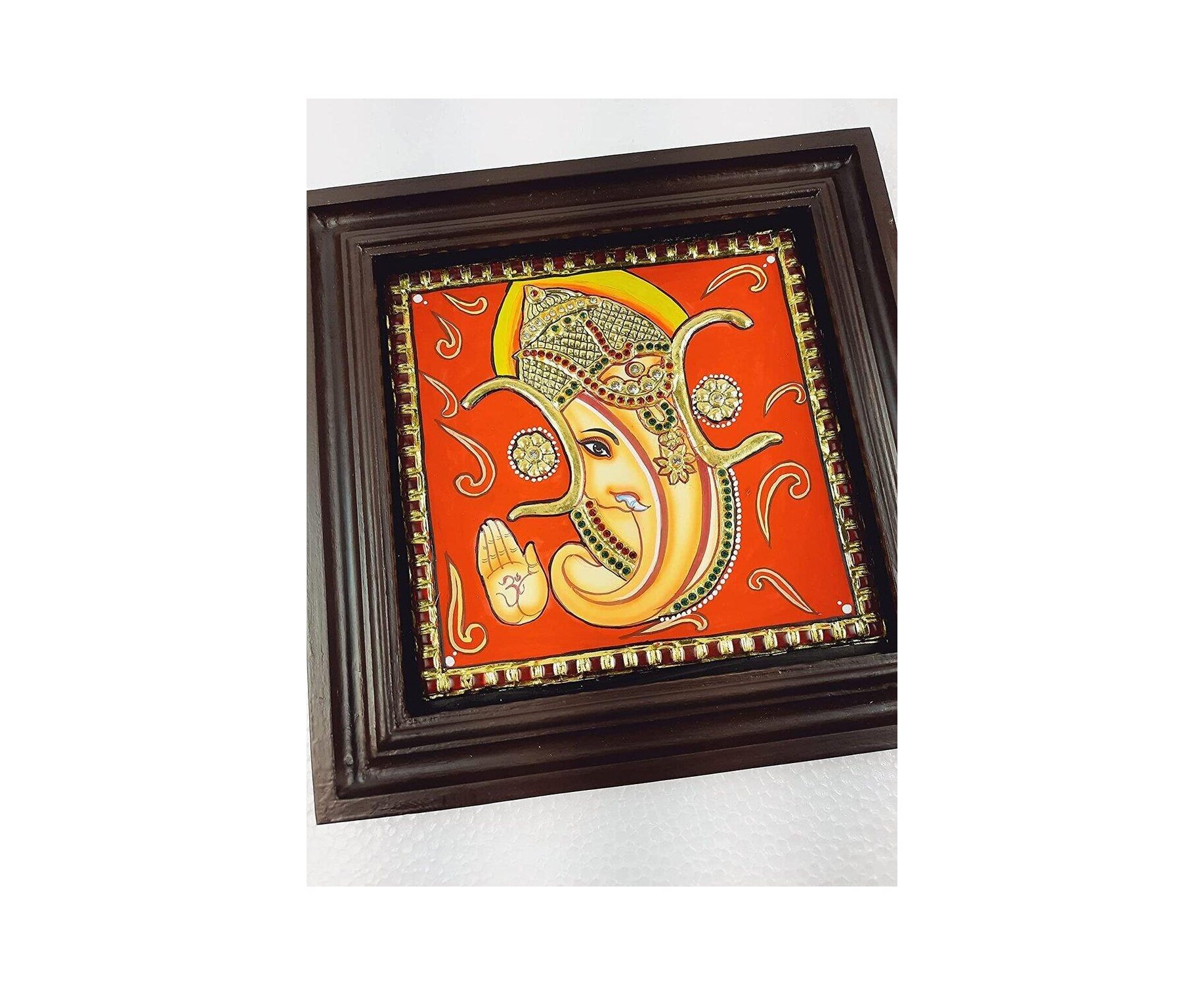 Ganesha Tanjore Painting, Lord Ganesha Indian Handmade Embossed Painting with Wooden Frame for Wall Decor, Room Decor, Gift Items