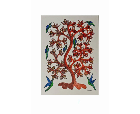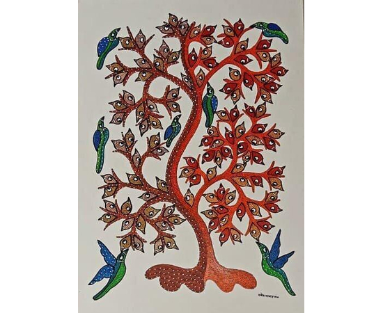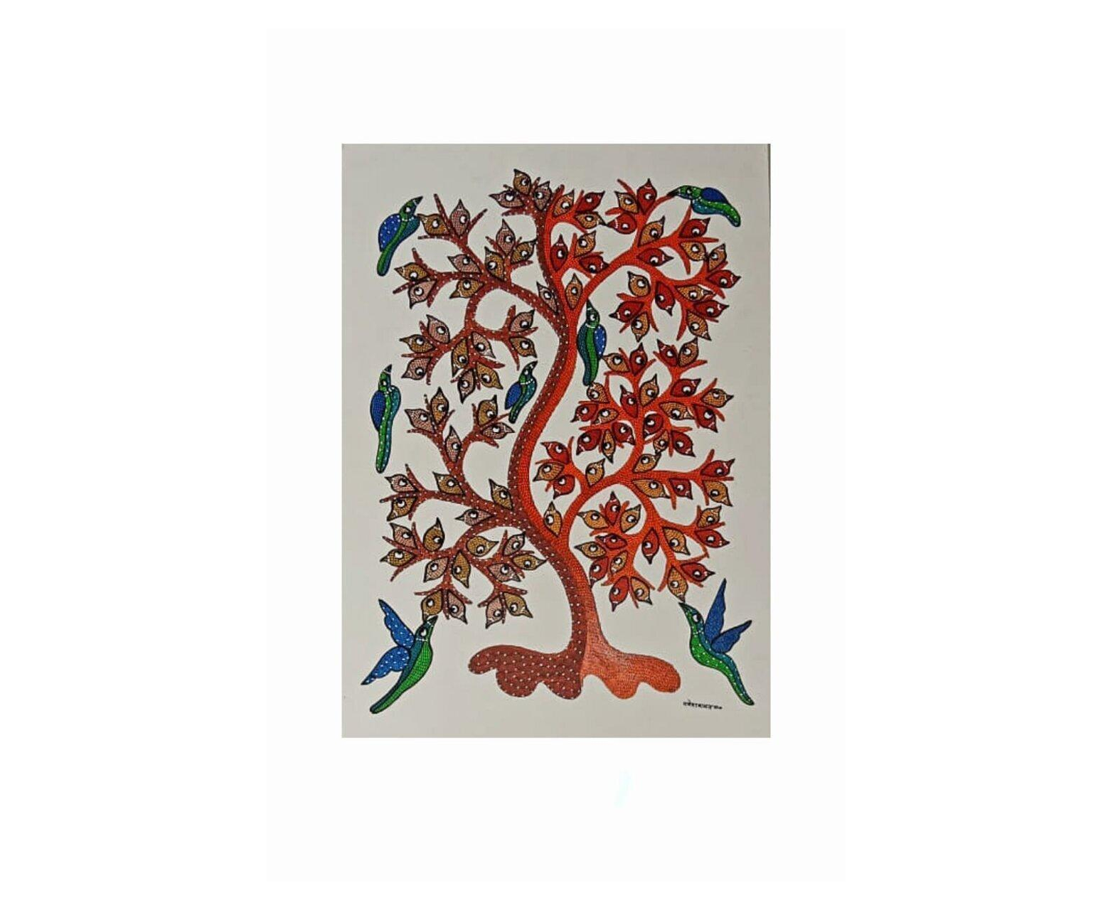 Gond Hand Painting Tree Of Life - Original Gond Art Painting - Indian tribal painting - Handmade paper - Tree & Birds painting