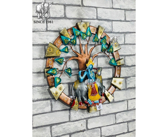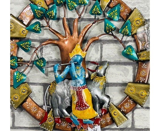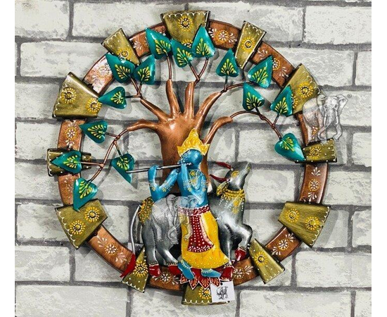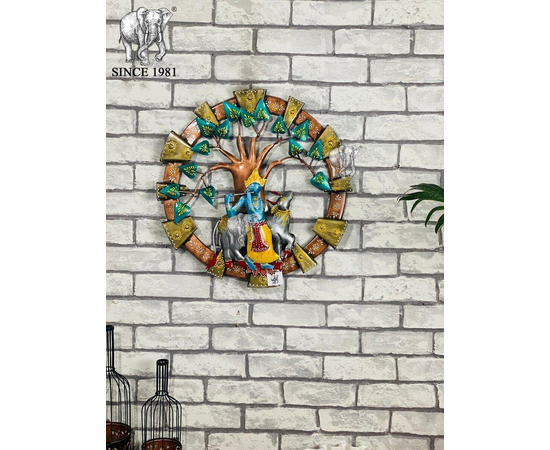 Metal Cow Krishna wall art Ethnic Hand Crafted Krishna Under Tree Round Wall Decor High Showpiece