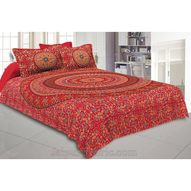 Indian Handemade Set Of 3 Ruby Red Mandala Bedsheet Tapestry Floral Print With 2 Pillow Covers, Bedding With Pillow Cover, 100% Cotton Bedsheet Throw